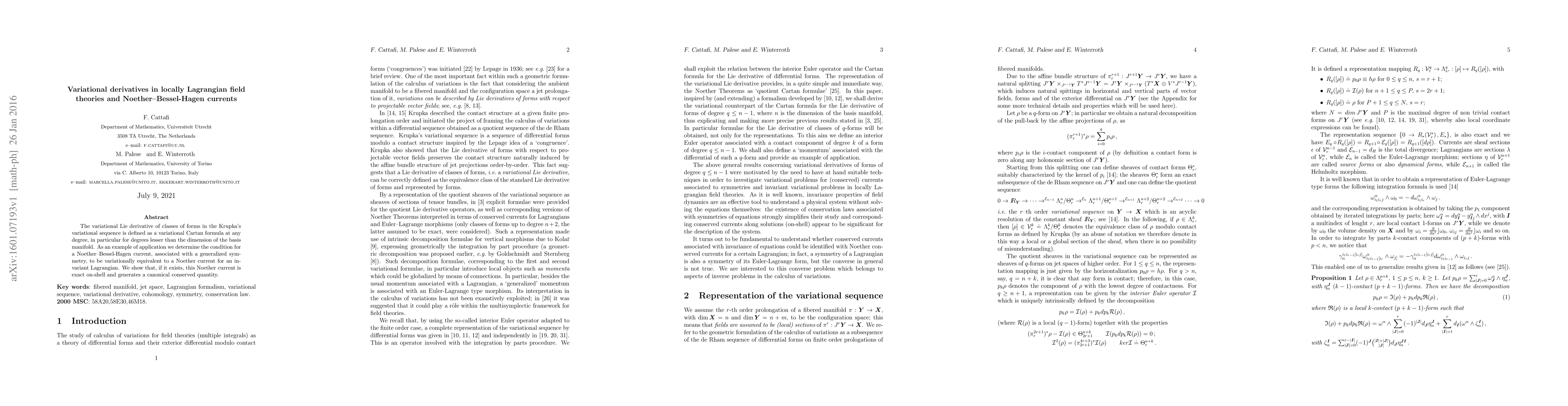 Researchers introduce a new method to analyze variational derivatives in locally Lagrangian field theories, linking them to Noether-Bessel-Hagen currents and invariant Lagrangians. They show that certain Noether currents can be variationally equivalent, generating exact canonical conserved quantities.