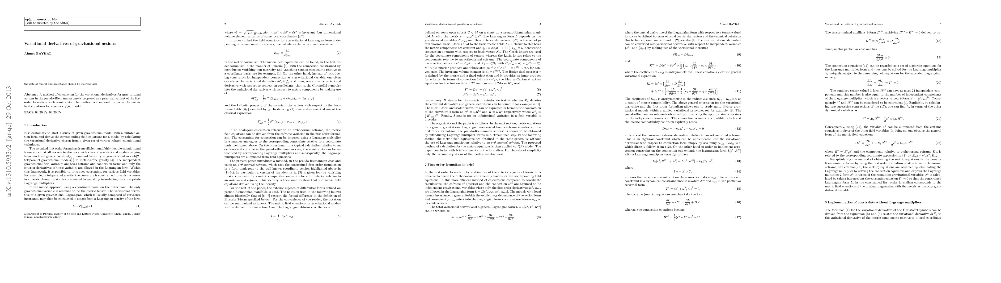This paper proposes a method for calculating variational derivatives of gravitational actions in the pseudo-Riemannian case, utilizing a first-order formalism with constraints. The method is applied to derive the metric field equations for a generic $f(R)$ model.