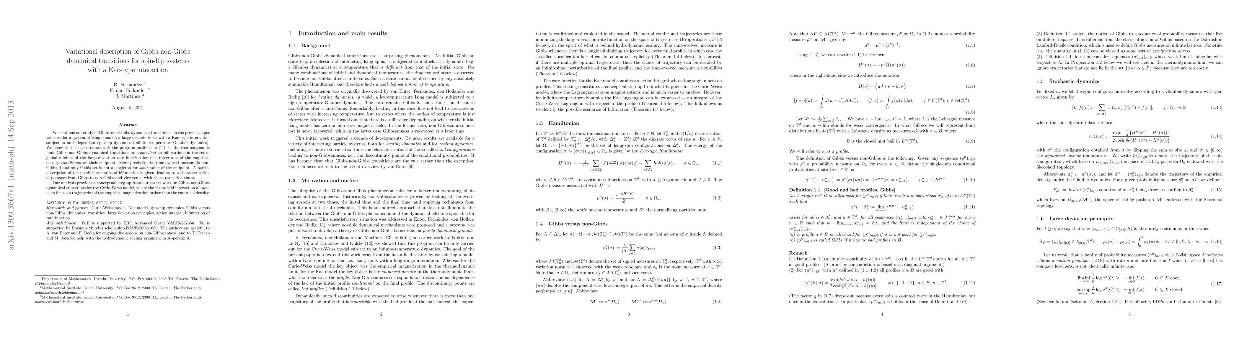The paper establishes a fundamental link between the specification kernel and the minimizer of the large-deviation rate function, providing a variational description of Gibbs-non-Gibbs dynamical transitions for spin-flip systems with Kac-type interactions.