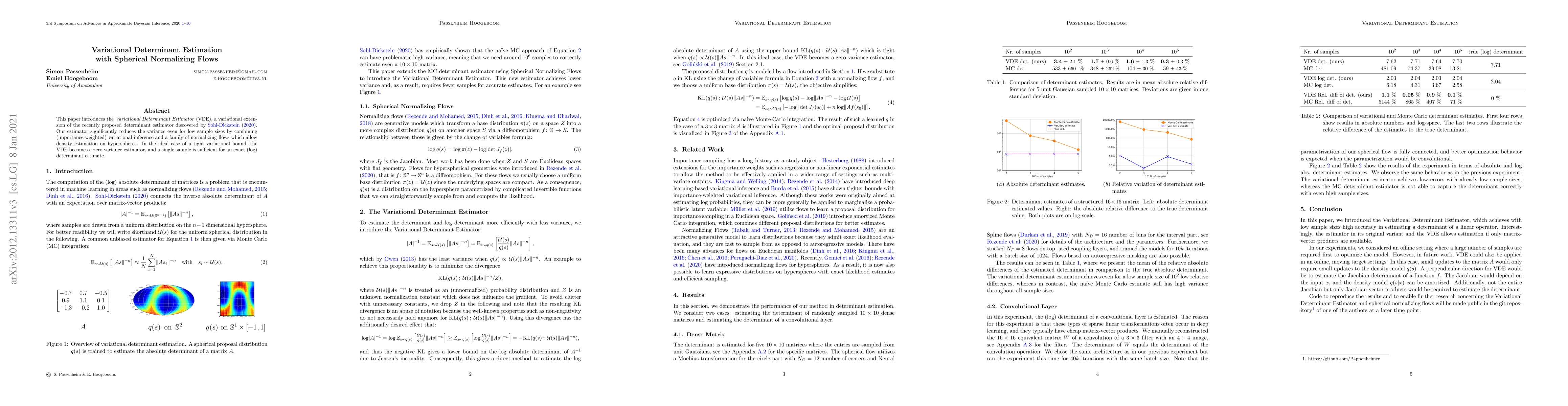 This paper presents the Variational Determinant Estimator (VDE), which combines variational inference with spherical normalizing flows to reduce variance in determinant estimation. In ideal conditions, VDE achieves zero variance and can provide an exact determinant estimate with just one sample.