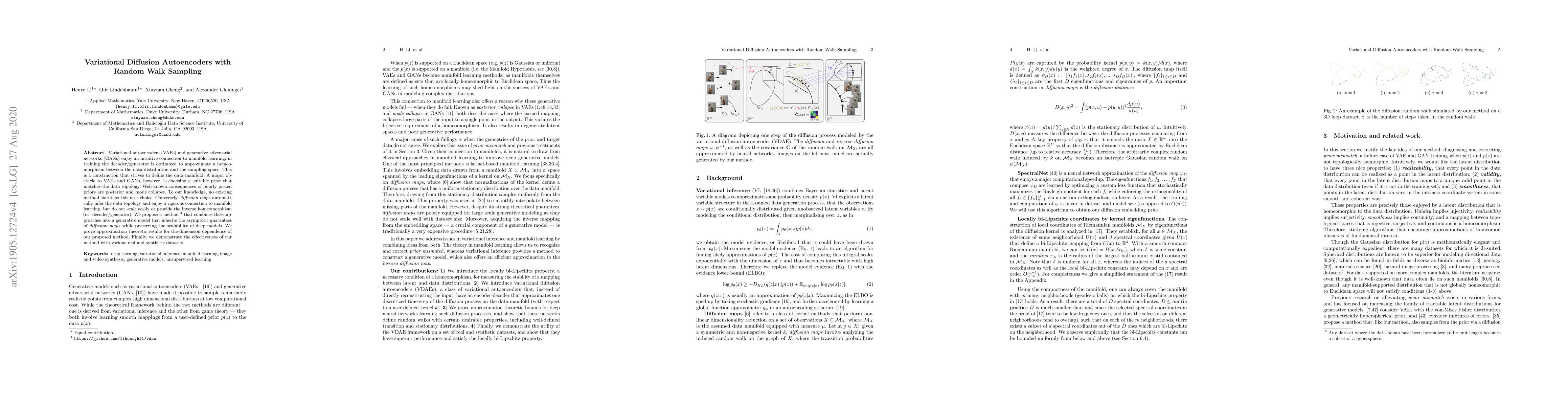 Variational autoencoders (VAEs) and generative adversarial networks (GANs) enjoy an intuitive connection to manifold learning: in training the decoder/generator is optimized to approximate a homeomorphism between the data distribution and the sampling space. This is a construction that strives to define the data manifold. A major obstacle to VAEs and GANs, however, is choosing a suitable prior that matches the data topology. Well-known consequences of poorly picked priors are posterior and mode collapse. To our knowledge, no existing method sidesteps this user choice. Conversely, $\textit{diffusion maps}$ automatically infer the data topology and enjoy a rigorous connection to manifold learning, but do not scale easily or provide the inverse homeomorphism (i.e. decoder/generator). We propose a method that combines these approaches into a generative model that inherits the asymptotic guarantees of $\textit{diffusion maps}$ while preserving the scalability of deep models. We prove approximation theoretic results for the dimension dependence of our proposed method. Finally, we demonstrate the effectiveness of our method with various real and synthetic datasets.
