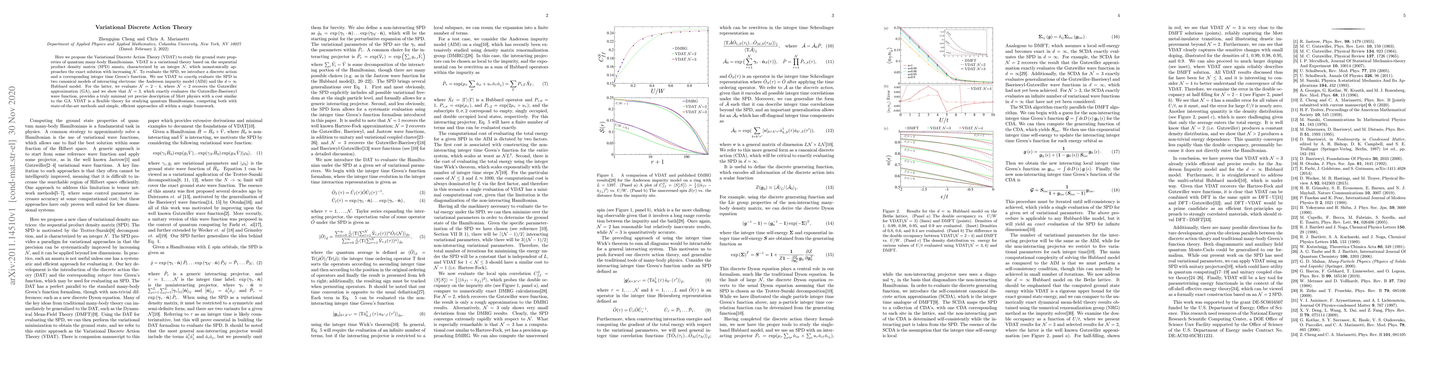 The Variational Discrete Action Theory (VDAT) is a new method for studying quantum many-body Hamiltonians, offering a flexible approach that competes with state-of-the-art methods and simple approaches in a single framework. VDAT exactly evaluates the ground state properties of two models: the Anderson impurity model and the d=∞ Hubbard model.