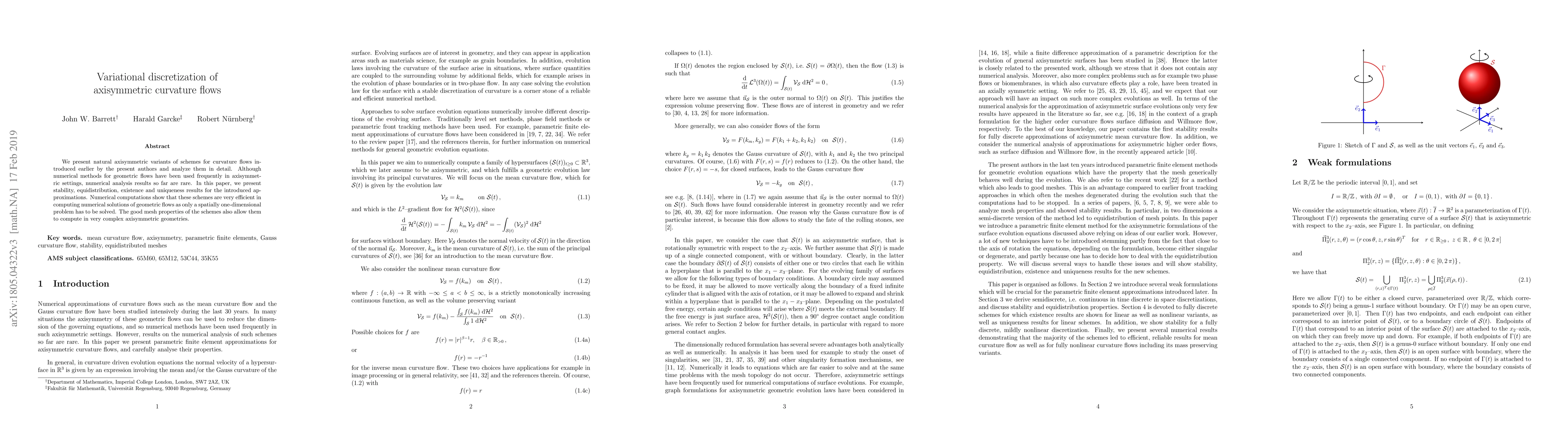 This paper introduces axisymmetric variants of curvature flow schemes and provides detailed numerical analysis, including stability, equidistribution, existence, and uniqueness results. The proposed methods are efficient and effective for solving geometric flows in complex axisymmetric geometries due to their good mesh properties and reduced computational complexity.