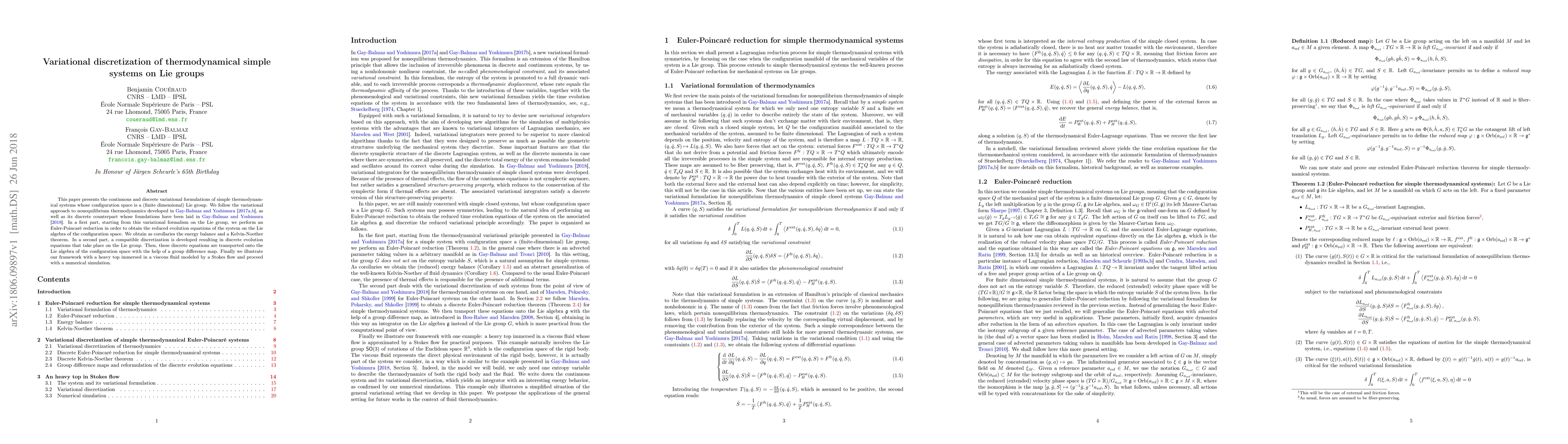 This paper develops continuous and discrete variational formulations for simple thermodynamical systems on Lie groups, employing Euler-Poincaré reduction to derive reduced evolution equations and a compatible discretization for numerical simulation, exemplified by a heavy top in a viscous fluid.
