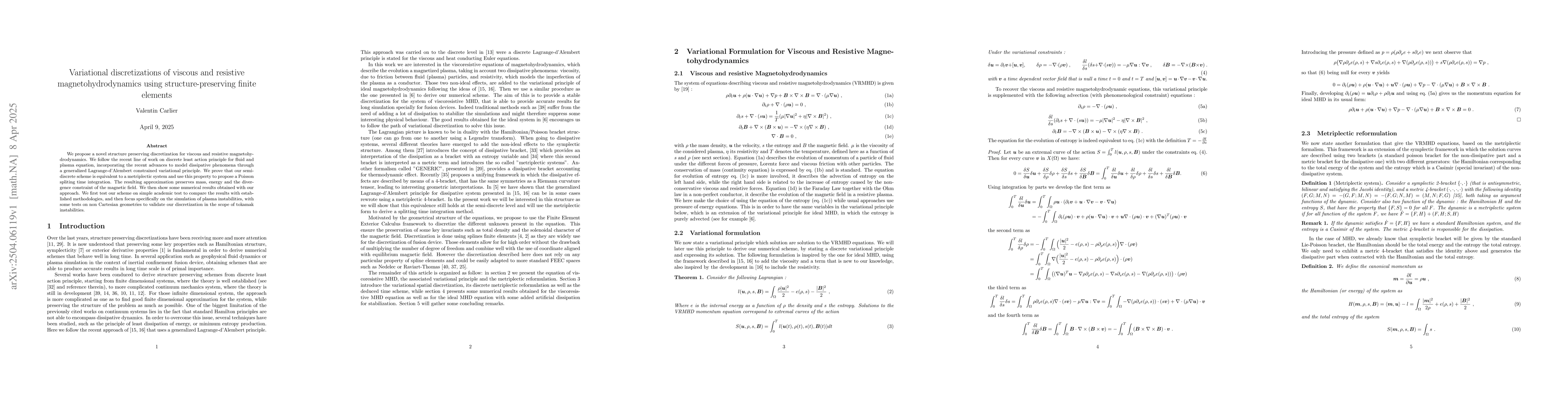 The paper introduces a novel variational discretization method for viscous and resistive MHD equations that preserves mass, energy, and divergence-free constraints of the magnetic field, along with a metriplectic time integration scheme.