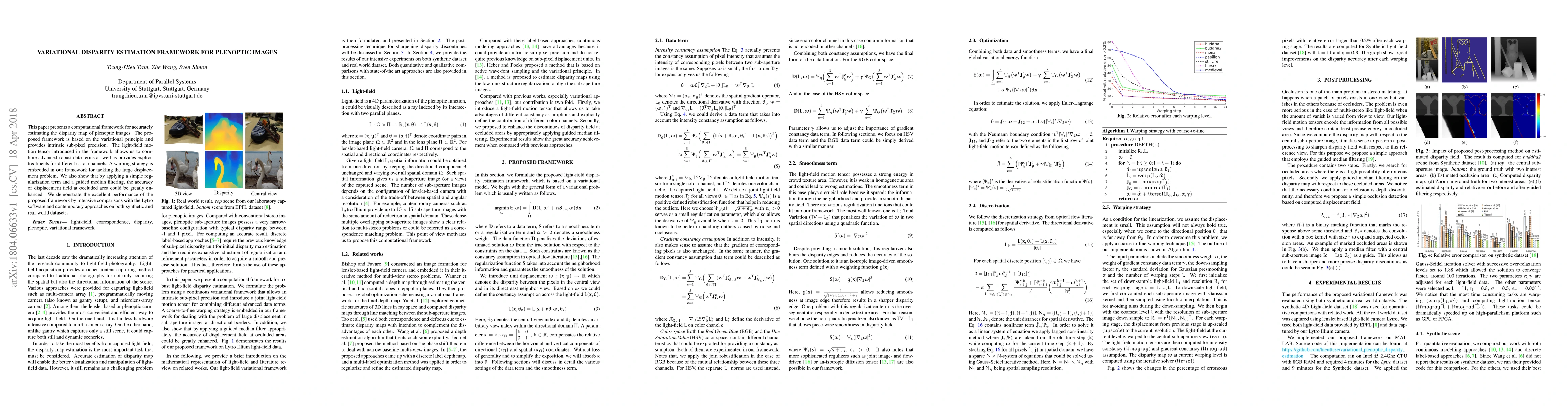 This paper presents a computational framework for accurately estimating the disparity map of plenoptic images. The proposed framework is based on the variational principle and provides intrinsic sub-pixel precision. The light-field motion tensor introduced in the framework allows us to combine advanced robust data terms as well as provides explicit treatments for different color channels. A warping strategy is embedded in our framework for tackling the large displacement problem. We also show that by applying a simple regularization term and a guided median filtering, the accuracy of displacement field at occluded area could be greatly enhanced. We demonstrate the excellent performance of the proposed framework by intensive comparisons with the Lytro software and contemporary approaches on both synthetic and real-world datasets.