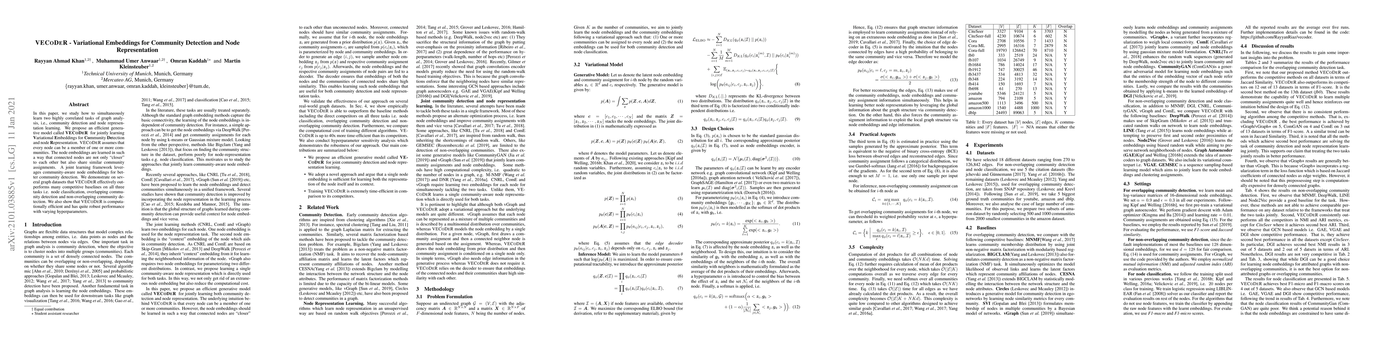 This paper proposes VECoDeR, a generative model for jointly learning Variational Embeddings for Community Detection and node Representation, achieving superior performance on node classification and community detection tasks while maintaining computational efficiency. VECoDeR demonstrates robust performance across various graph datasets and hyperparameters.