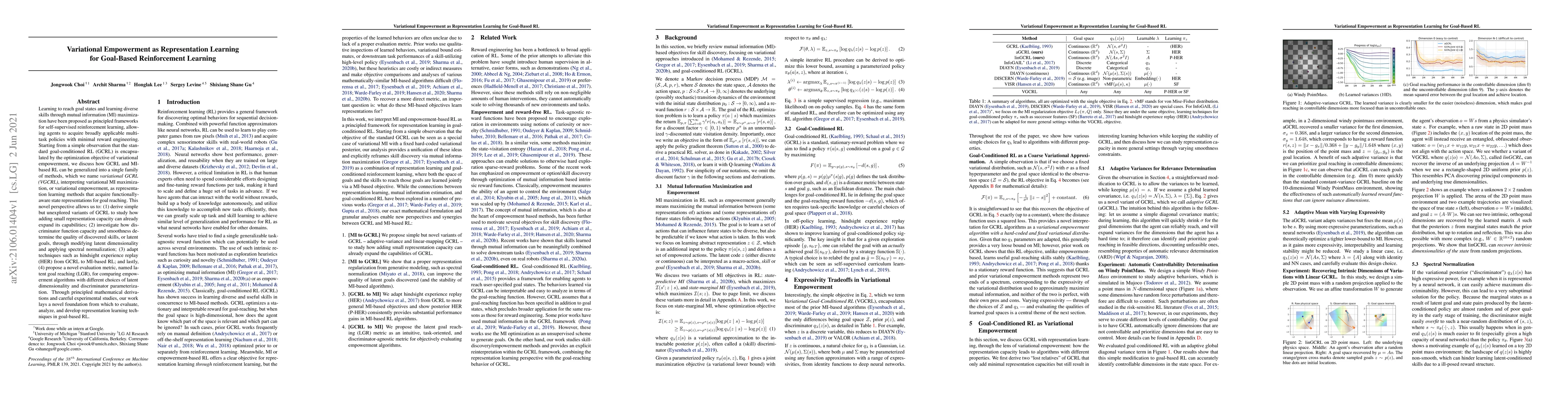 This paper proposes variational GCRL (VGCRL) as a unified framework for goal-based reinforcement learning, interpreting variational empowerment as representation learning. It introduces new variants of goal-conditioned RL, explores the impact of discriminator capacity on skill discovery, and proposes a novel evaluation metric for comparing empowerment algorithms.