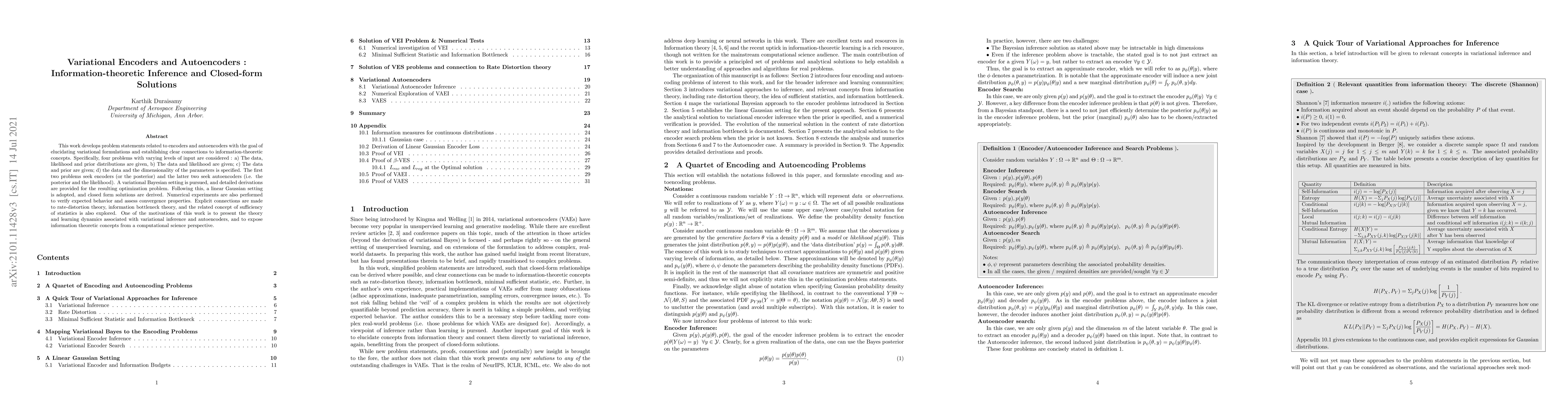 This work develops problem statements related to encoders and autoencoders with the goal of elucidating variational formulations and establishing clear connections to information-theoretic concepts. Specifically, four problems with varying levels of input are considered : a) The data, likelihood and prior distributions are given, b) The data and likelihood are given; c) The data and prior are given; d) the data and the dimensionality of the parameters is specified. The first two problems seek encoders (or the posterior) and the latter two seek autoencoders (i.e. the posterior and the likelihood). A variational Bayesian setting is pursued, and detailed derivations are provided for the resulting optimization problem. Following this, a linear Gaussian setting is adopted, and closed form solutions are derived. Numerical experiments are also performed to verify expected behavior and assess convergence properties. Explicit connections are made to rate-distortion theory, information bottleneck theory, and the related concept of sufficiency of statistics is also explored. One of the motivations of this work is to present the theory and learning dynamics associated with variational inference and autoencoders, and to expose information theoretic concepts from a computational science perspective.