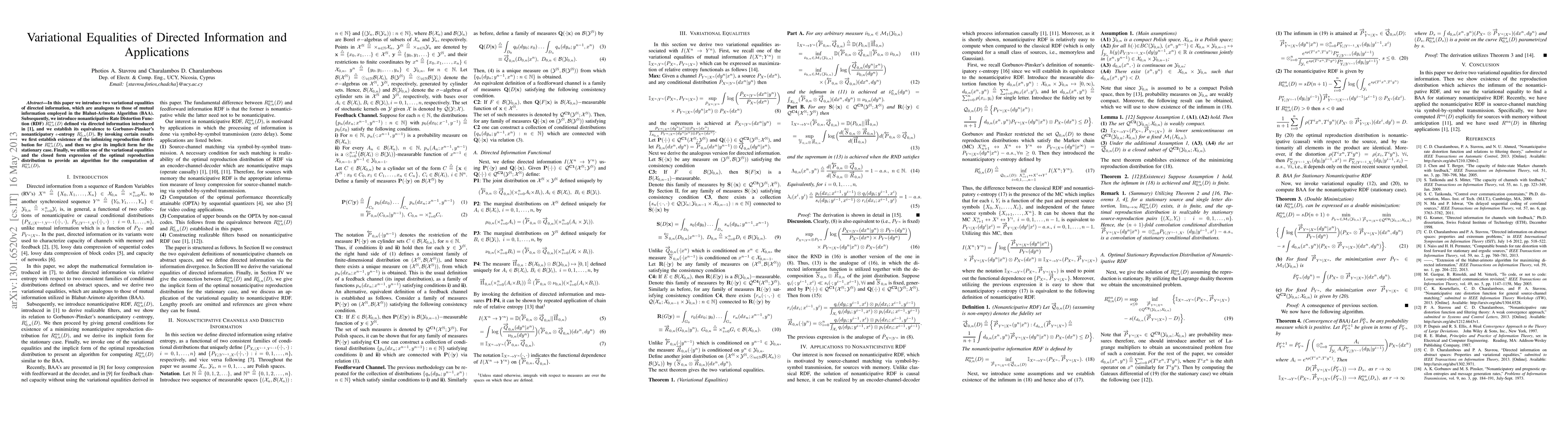This paper introduces variational equalities of directed information akin to mutual information's role in the Blahut-Arimoto Algorithm. It defines a nonanticipative Rate Distortion Function using directed information and proves its equivalence to Gorbunov-Pinsker's nonanticipatory $\epsilon$-entropy, providing an algorithm for its computation.