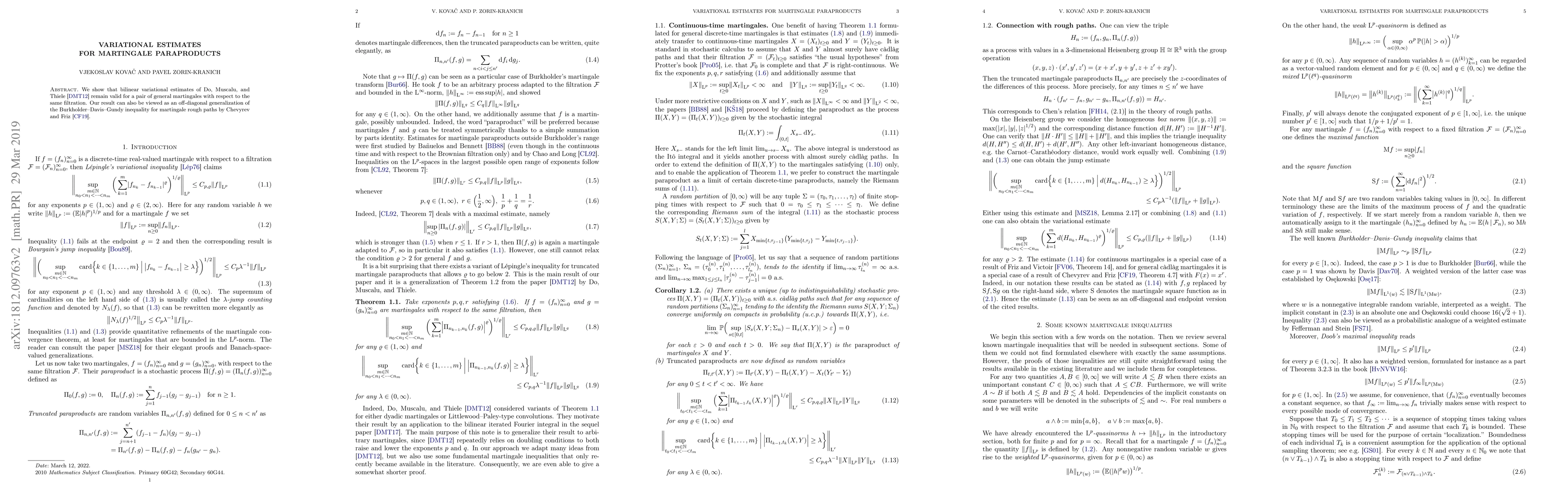 This paper demonstrates that bilinear variational estimates for martingale paraproducts hold for general martingales under the same filtration, extending the results of Do, Muscalu, and Thiele. Additionally, it provides an off-diagonal generalization of the Burkholder-Davis-Gundy inequality for martingale rough paths.