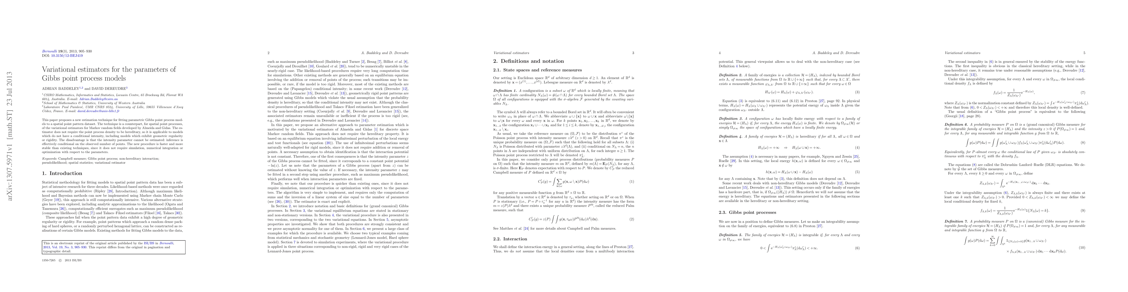 This paper introduces a new variational estimation technique for Gibbs point process models, offering a faster and more stable alternative to existing methods without requiring simulation or numerical integration. Unlike traditional methods, it can fit models without a conditional intensity, though it cannot estimate the intensity parameter.