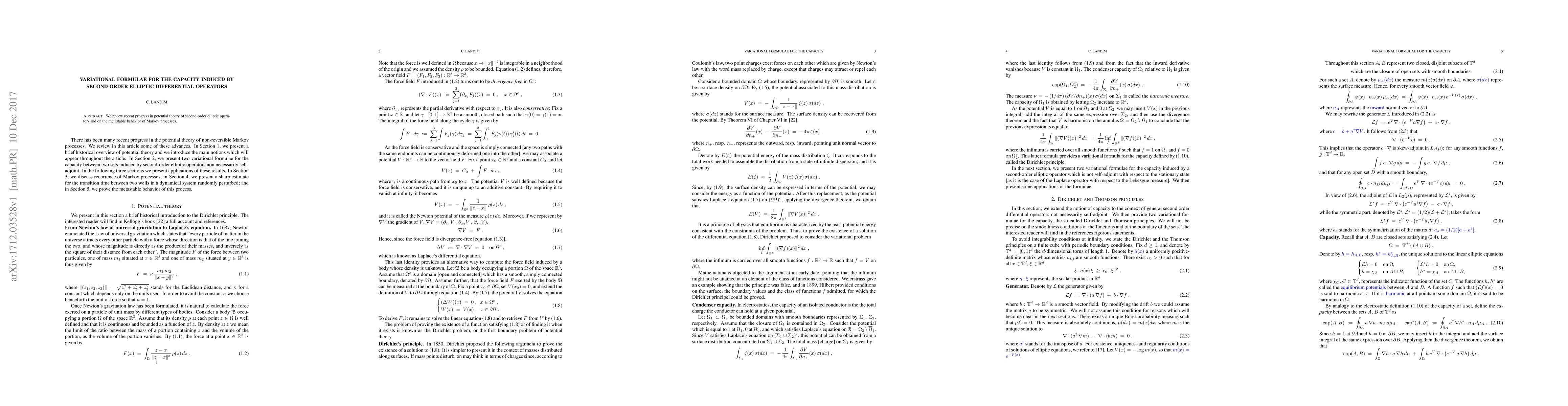 We review recent progress in potential theory of second-order elliptic operators and on the metastable behavior of Markov processes.