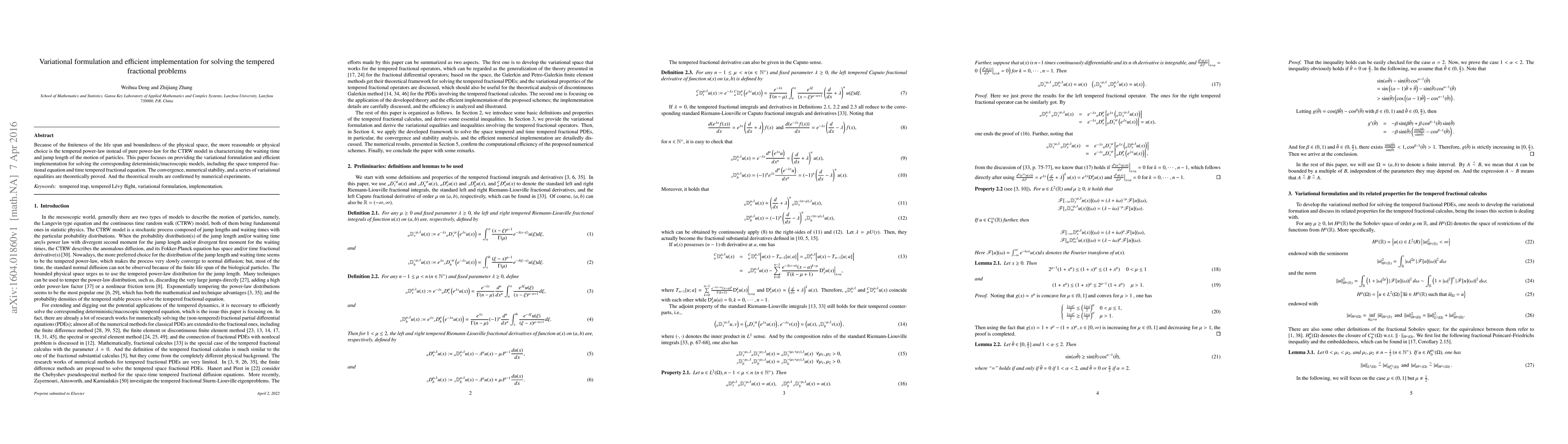 Because of the finiteness of the life span and boundedness of the physical space, the more reasonable or physical choice is the tempered power-law instead of pure power-law for the CTRW model in characterizing the waiting time and jump length of the motion of particles. This paper focuses on providing the variational formulation and efficient implementation for solving the corresponding deterministic/macroscopic models, including the space tempered fractional equation and time tempered fractional equation. The convergence, numerical stability, and a series of variational equalities are theoretically proved. And the theoretical results are confirmed by numerical experiments.