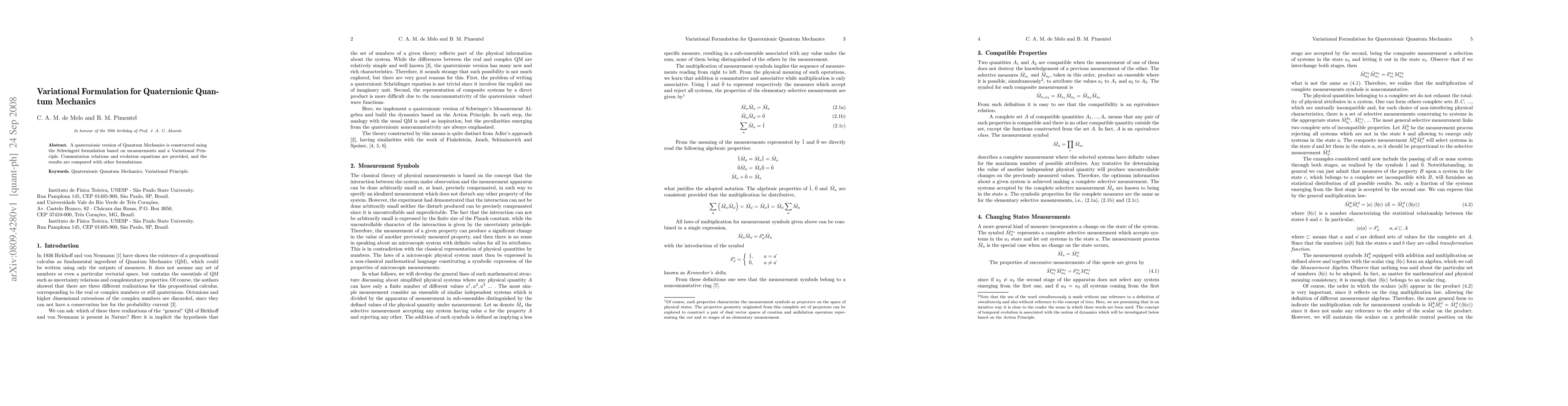 This paper constructs a quaternionic version of Quantum Mechanics using Schwinger's variational formulation, detailing commutation relations and evolution equations. It compares these results with other existing formulations to highlight the unique aspects of the quaternionic approach.