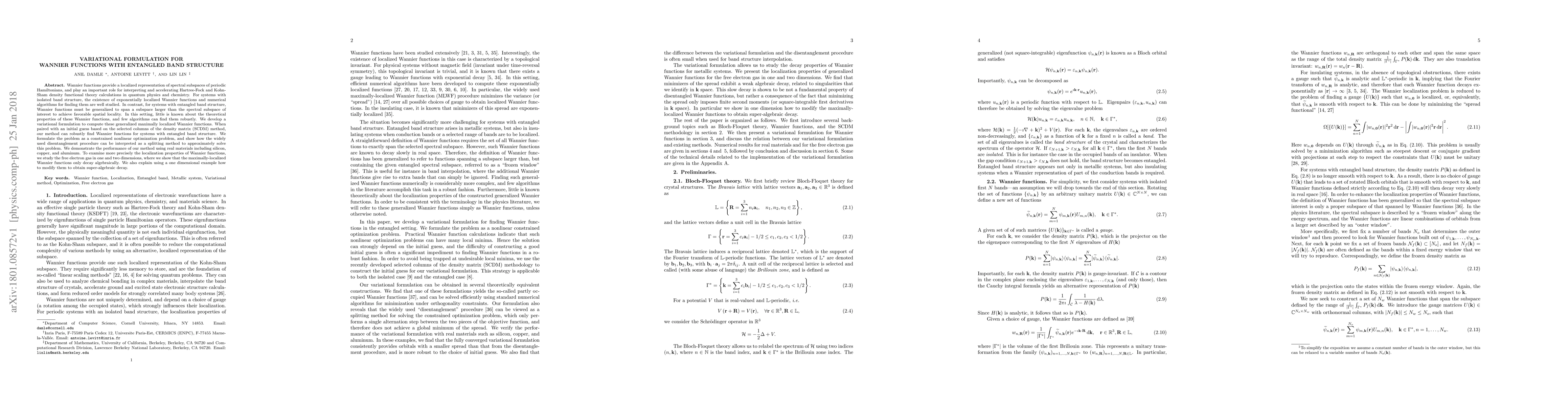 This paper develops a variational formulation for computing generalized Wannier functions for systems with entangled band structures, which are essential for localized quantum physics and chemistry calculations. The proposed method, when combined with the SCDM initial guess, robustly finds these functions through a constrained nonlinear optimization approach, demonstrating effectiveness in real materials and showing that maximally localized Wannier functions decay only algebraically, with potential for super-algebraic decay modifications.
