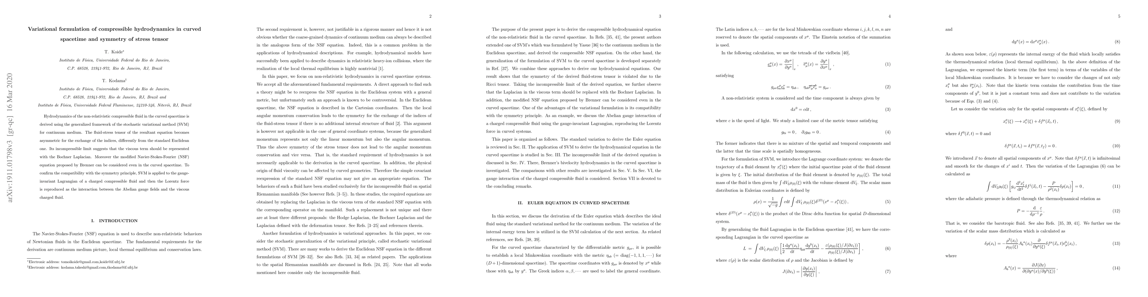 Hydrodynamics of the non-relativistic compressible fluid in the curved spacetime is derived using the generalized framework of the stochastic variational method (SVM) for continuum medium. The fluid-stress tensor of the resultant equation becomes asymmetric for the exchange of the indices, differently from the standard Euclidean one. Its incompressible limit suggests that the viscous term should be represented with the Bochner Laplacian. Moreover the modified Navier-Stokes-Fourier (NSF) equation proposed by Brenner can be considered even in the curved spacetime. To confirm the compatibility with the symmetry principle, SVM is applied to the gauge-invariant Lagrangian of a charged compressible fluid and then the Lorentz force is reproduced as the interaction between the Abelian gauge fields and the viscous charged fluid.