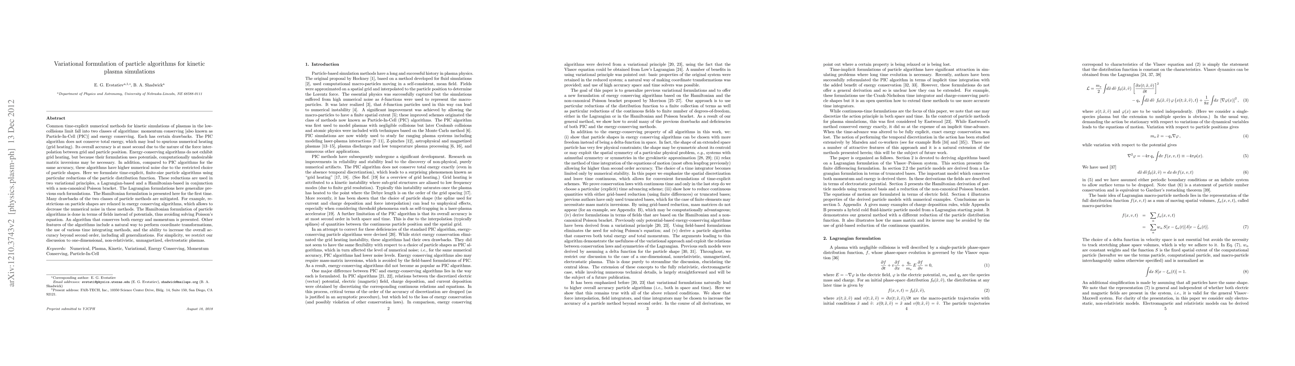 Common time-explicit numerical methods for kinetic simulations of plasmas in the low-collisions limit fall into two classes of algorithms: momentum conserving and energy conserving. Each has certain drawbacks. The PIC algorithm does not conserve total energy, which may lead to spurious numerical heating (grid heating). Its overall accuracy is at most second due to the nature of the force interpolation between grid and particle position. Energy-conserving algorithms do not exhibit grid heating, but because their formulation uses potentials, computationally undesirable matrix inversions may be necessary. In addition, compared to PIC algorithms for the same accuracy, these algorithms have higher numerical noise due to the restricted choice of particle shapes. Here we formulate time-explicit, finite-size particle algorithms using particular reductions of the particle distribution function. These reductions are used in two variational principles, a Lagrangian-based and a Hamiltonian-based in conjunction with a non-canonical Poisson bracket. The Lagrangian formulations here generalize previous such formulations. The Hamiltonian formulation is presented here for the first time. Many drawbacks of the two classes of particle methods are mitigated. For example, restrictions on particle shapes are relaxed in energy conserving algorithms, which allows to decrease the numerical noise in these methods. The Hamiltonian formulation of particle algorithms is done in terms of fields instead of potentials, thus avoiding solving Poisson's equation. An algorithm that conserves both energy and momentum is presented. Other features of the algorithms include a natural way to perform coordinate transformations, the use of various time integrating methods, and the ability to increase the overall accuracy beyond second order, including all generalizations.