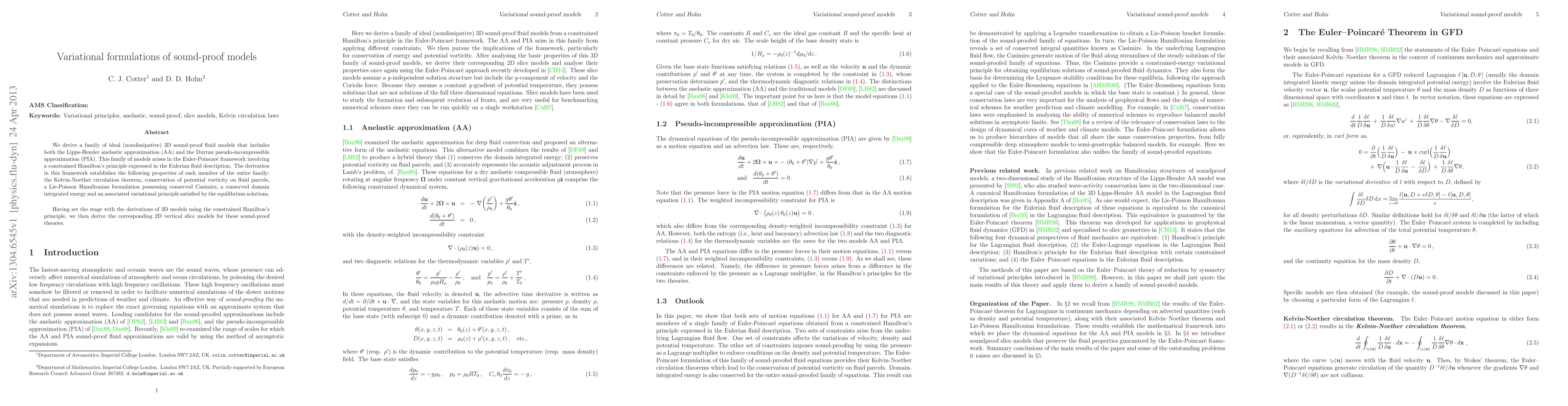 We derive a family of ideal (nondissipative) 3D sound-proof fluid models that includes both the Lipps-Hemler anelastic approximation (AA) and the Durran pseudo-incompressible approximation (PIA). This family of models arises in the Euler-Poincar\'{e} framework involving a constrained Hamilton's principle expressed in the Eulerian fluid description. The derivation in this framework establishes the following properties of each member of the entire family: the Kelvin-Noether circulation theorem, conservation of potential vorticity on fluid parcels, a Lie-Poisson Hamiltonian formulation possessing conserved Casimirs, a conserved domain integrated energy and an associated variational principle satisfied by the equilibrium solutions. \smallskip Having set the stage with the derivations of 3D models using the constrained Hamilton's principle, we then derive the corresponding 2D vertical slice models for these sound-proof theories.