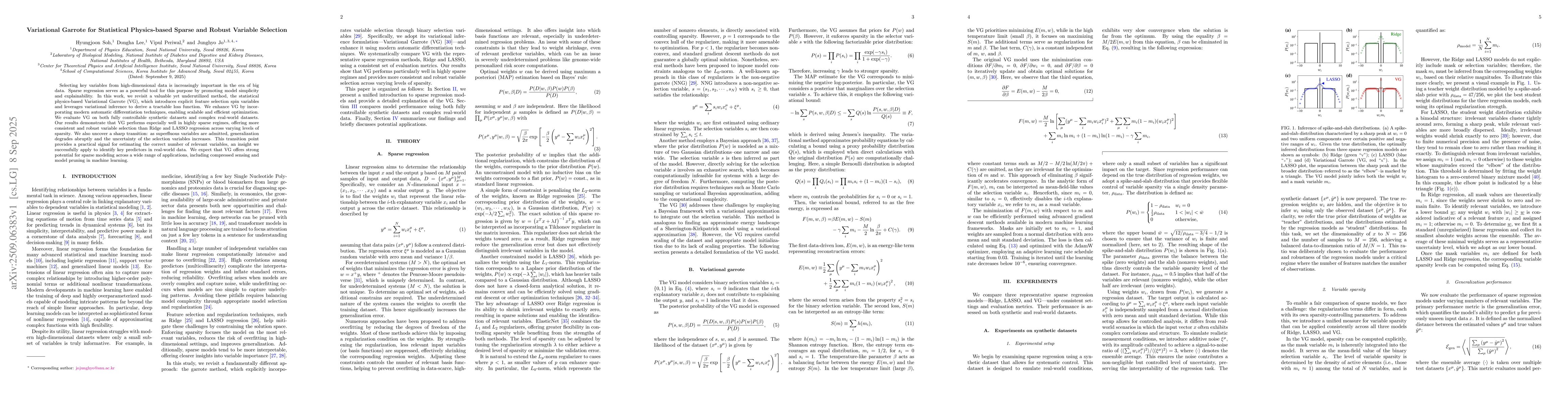Selecting key variables from high-dimensional data is increasingly important in the era of big data. Sparse regression serves as a powerful tool for this purpose by promoting model simplicity and explainability. In this work, we revisit a valuable yet underutilized method, the statistical physics-based Variational Garrote (VG), which introduces explicit feature selection spin variables and leverages variational inference to derive a tractable loss function. We enhance VG by incorporating modern automatic differentiation techniques, enabling scalable and efficient optimization. We evaluate VG on both fully controllable synthetic datasets and complex real-world datasets. Our results demonstrate that VG performs especially well in highly sparse regimes, offering more consistent and robust variable selection than Ridge and LASSO regression across varying levels of sparsity. We also uncover a sharp transition: as superfluous variables are admitted, generalization degrades abruptly and the uncertainty of the selection variables increases. This transition point provides a practical signal for estimating the correct number of relevant variables, an insight we successfully apply to identify key predictors in real-world data. We expect that VG offers strong potential for sparse modeling across a wide range of applications, including compressed sensing and model pruning in machine learning.