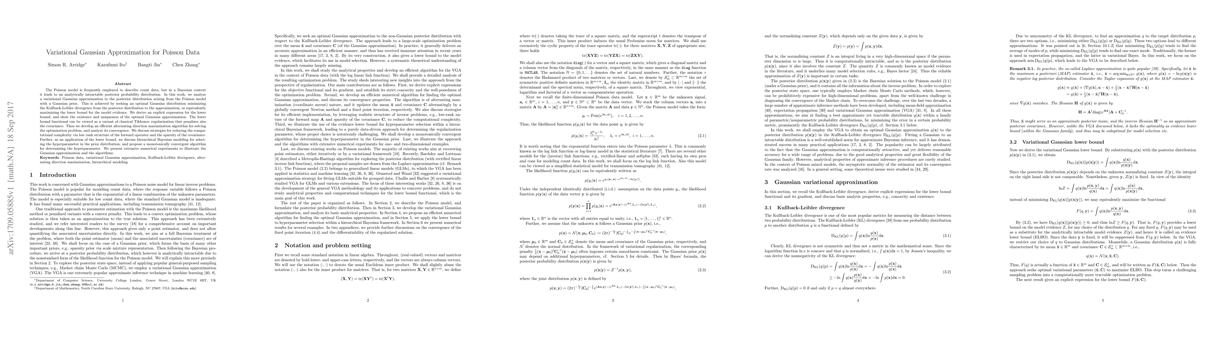 The paper presents a variational Gaussian approximation for Poisson data, utilizing a Gaussian prior and minimizing the Kullback-Leibler divergence to find an optimal Gaussian distribution approximating the posterior. It derives an explicit expression for the lower bound and develops an efficient alternating maximization algorithm for solving the optimization problem.