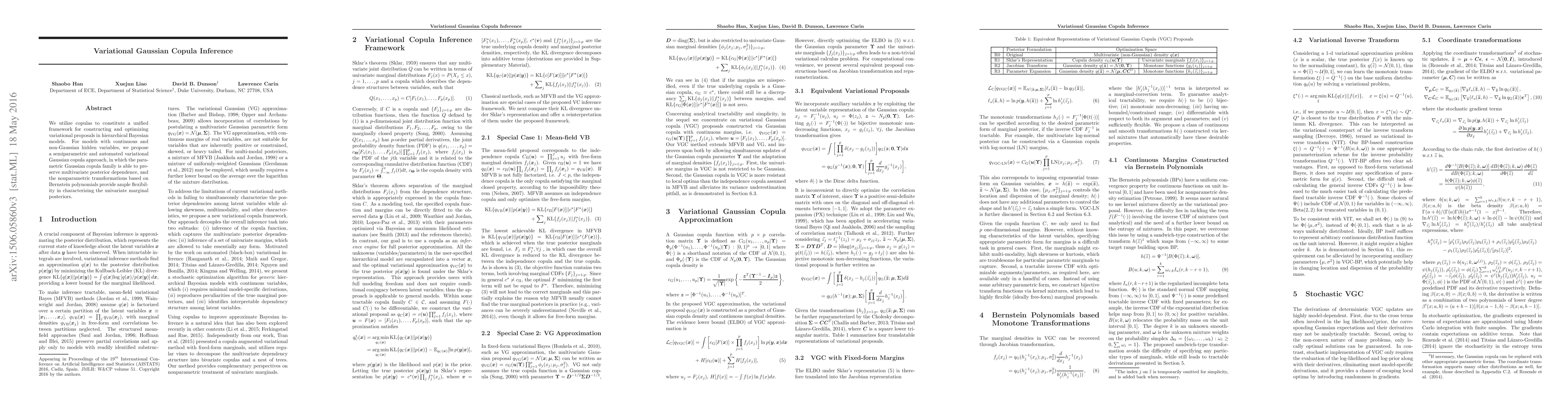 This paper proposes a semiparametric variational Gaussian copula approach to optimize inference in hierarchical Bayesian models, using a parametric Gaussian copula to preserve multivariate posterior dependence and Bernstein polynomials for flexible characterization of univariate marginal posteriors.