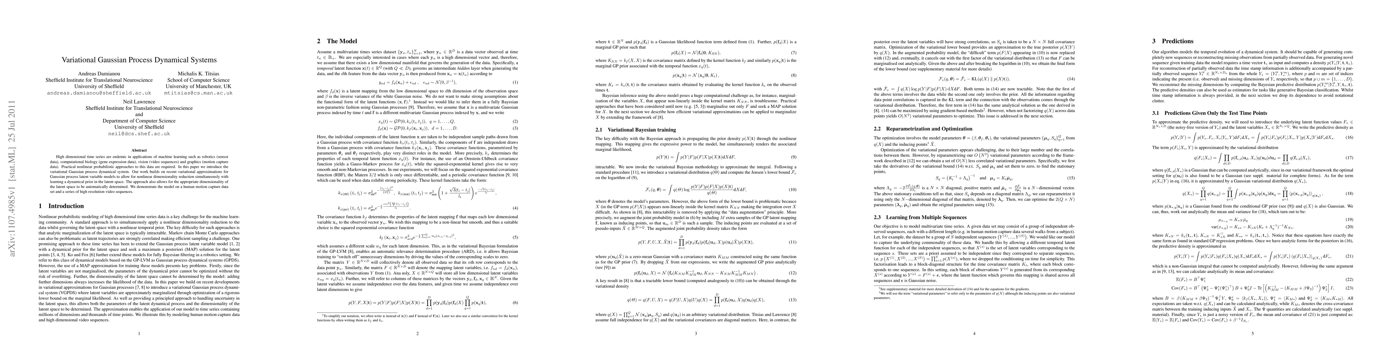 This paper introduces a variational Gaussian process dynamical system for modeling high-dimensional time series data, enabling nonlinear dimensionality reduction and automatic latent space determination. Demonstrated on human motion capture and high-resolution video sequences, the method provides a practical approach for complex machine learning applications.