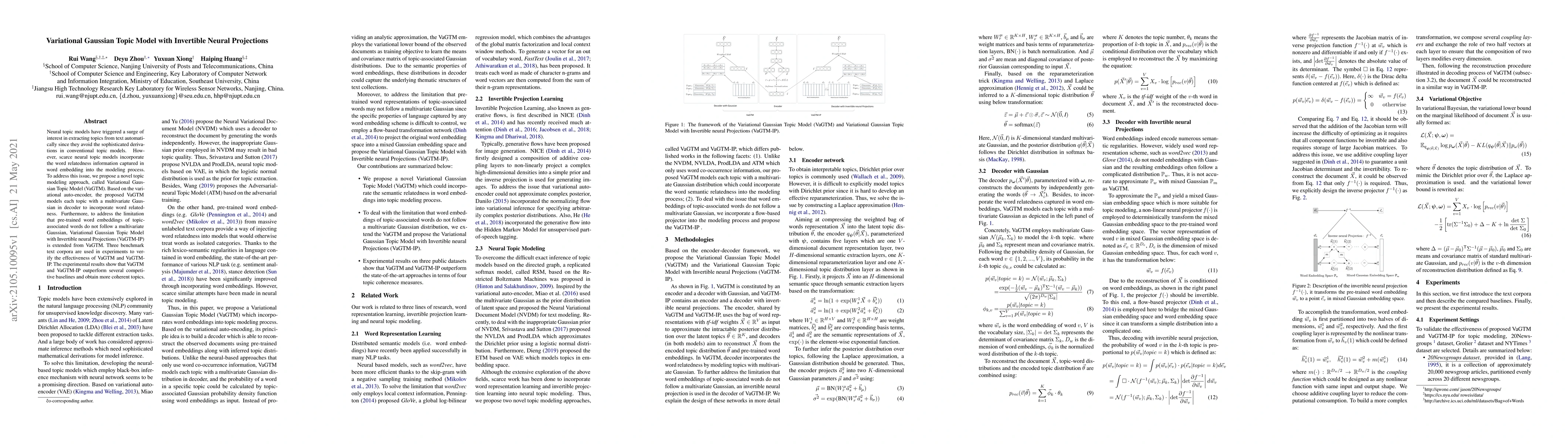 The paper proposes a Variational Gaussian Topic Model (VaGTM) that incorporates word relatedness through a multivariate Gaussian decoder, and extends it to VaGTM-IP to handle non-Gaussian pre-trained word embeddings. Experiments on three text corpora demonstrate that both models outperform baselines, achieving more coherent topics.