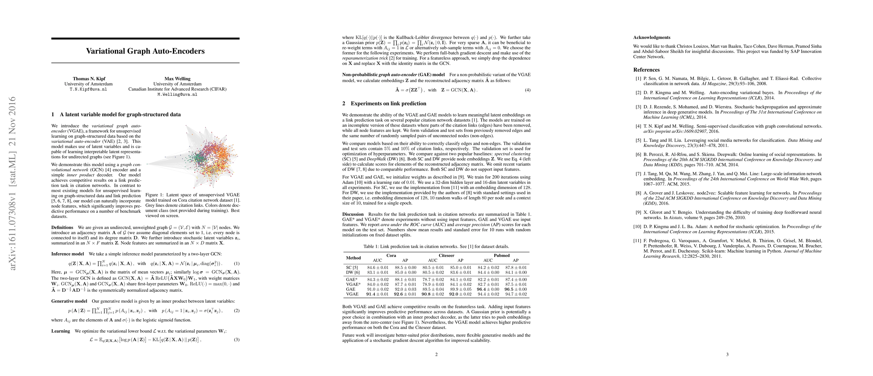 The variational graph auto-encoder (VGAE) is a framework for unsupervised learning on graph-structured data using latent variables, achieving competitive link prediction results in citation networks. Unlike other models, VGAE can naturally incorporate node features, significantly enhancing performance on benchmark datasets.