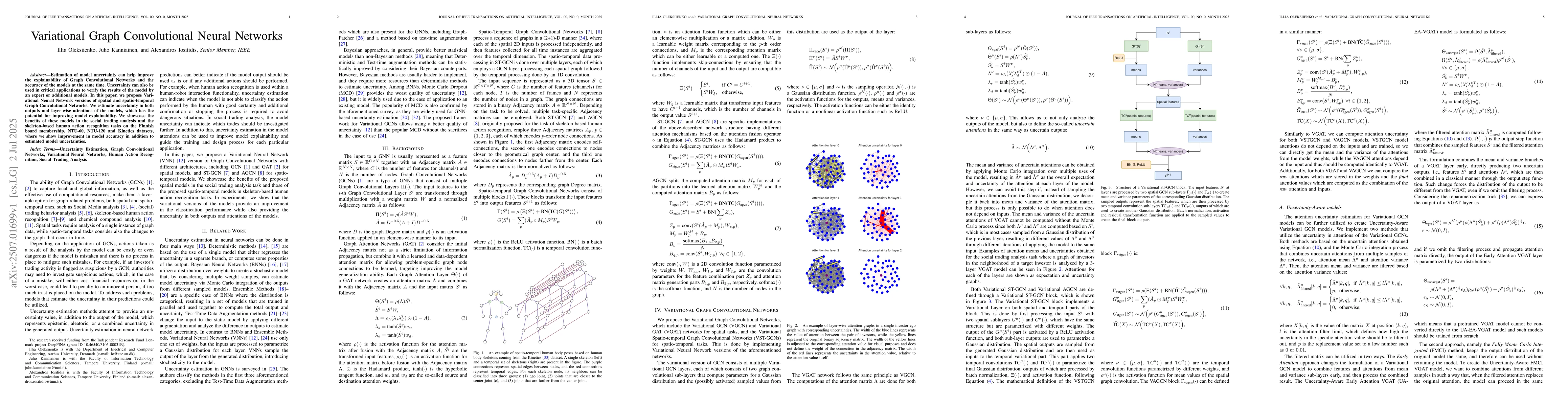 Estimation of model uncertainty can help improve the explainability of Graph Convolutional Networks and the accuracy of the models at the same time. Uncertainty can also be used in critical applications to verify the results of the model by an expert or additional models. In this paper, we propose Variational Neural Network versions of spatial and spatio-temporal Graph Convolutional Networks. We estimate uncertainty in both outputs and layer-wise attentions of the models, which has the potential for improving model explainability. We showcase the benefits of these models in the social trading analysis and the skeleton-based human action recognition tasks on the Finnish board membership, NTU-60, NTU-120 and Kinetics datasets, where we show improvement in model accuracy in addition to estimated model uncertainties.
