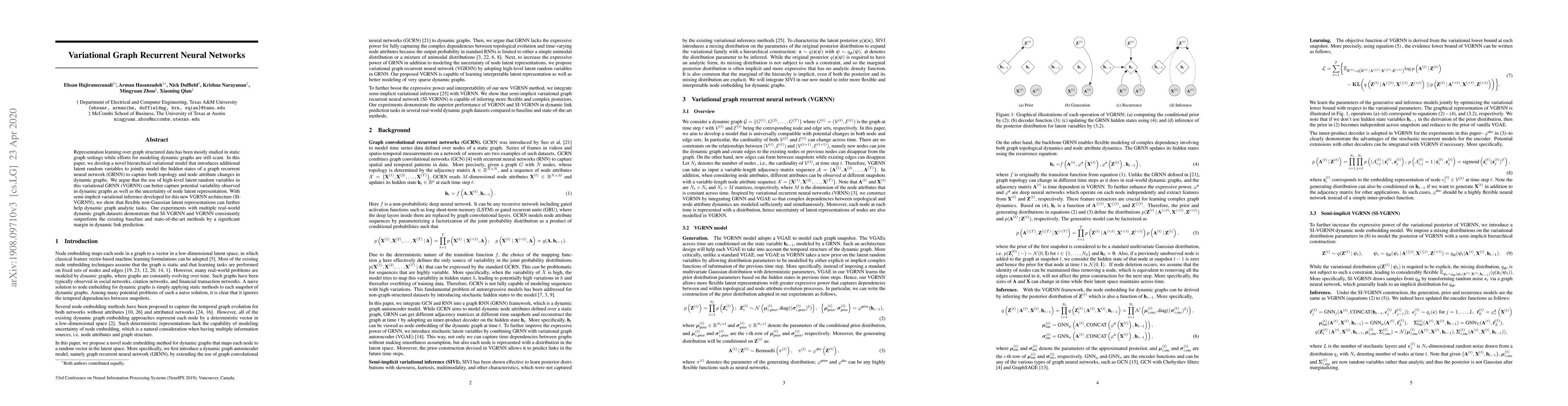 This paper introduces a hierarchical variational model for learning representations over dynamic graphs, employing a graph recurrent neural network with latent random variables to capture topology and node attribute changes. The semi-implicit variational inference method developed for this model shows superior performance in dynamic link prediction compared to existing methods.