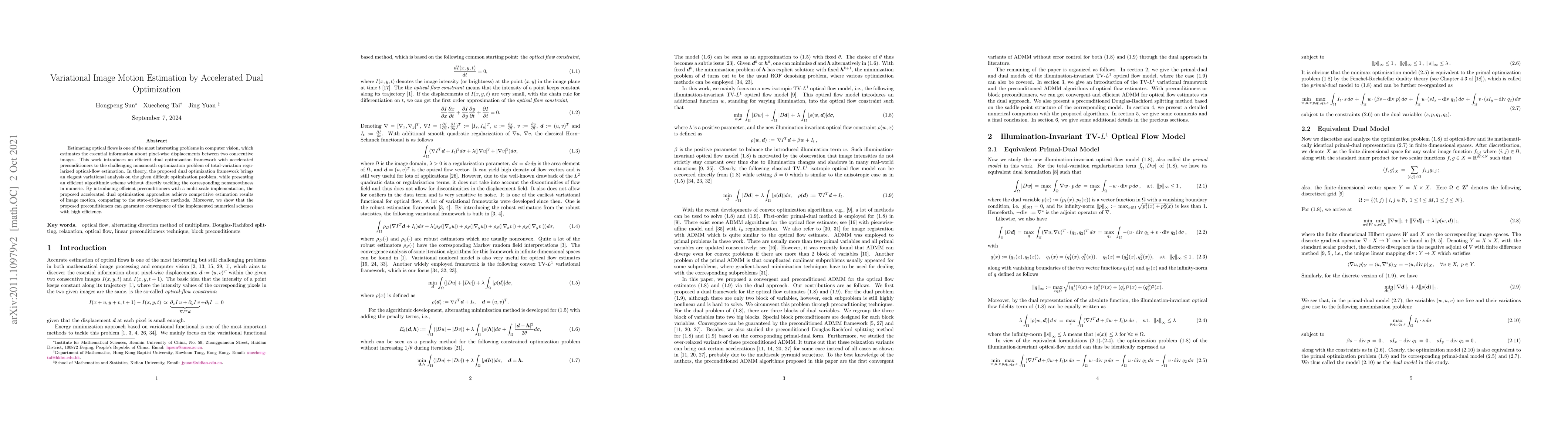 This paper proposes an efficient dual optimization framework with accelerated preconditioners for estimating optical flows, addressing the nonsmooth optimization problem of total-variation regularized optical-flow estimation. The method achieves competitive results compared to state-of-the-art techniques while ensuring convergence and high efficiency through multi-scale preconditioners.