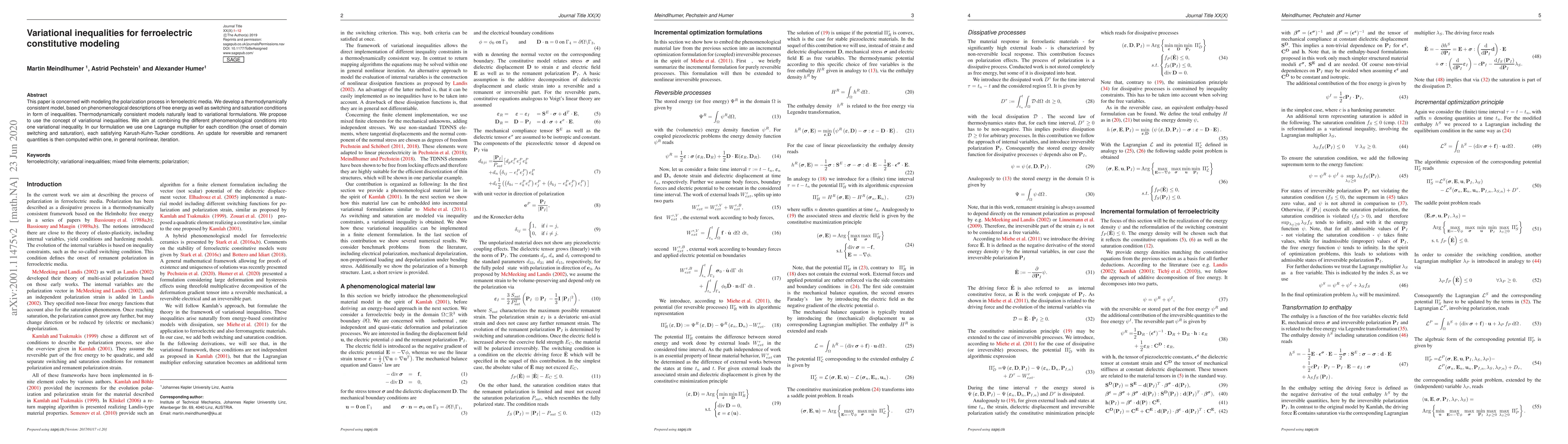 This paper introduces a thermodynamically consistent model for ferroelectric material polarization using variational inequalities. It combines various phenomenological conditions into one variational inequality, employing a single Lagrange multiplier for each condition, which simplifies the computation of updates for reversible and remanent quantities in a single, generally nonlinear iteration.