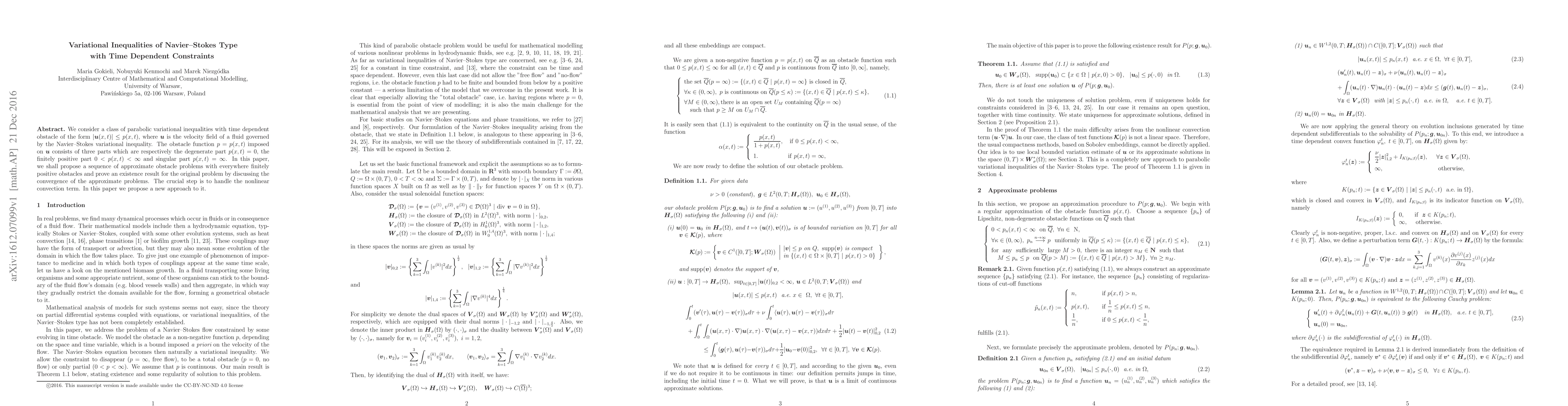 This paper explores parabolic variational inequalities for the Navier-Stokes equations with time-dependent constraints on the velocity field. It proposes a sequence of approximate problems with finitely positive obstacles and proves existence by analyzing convergence, focusing on a novel method to handle the nonlinear convection term.