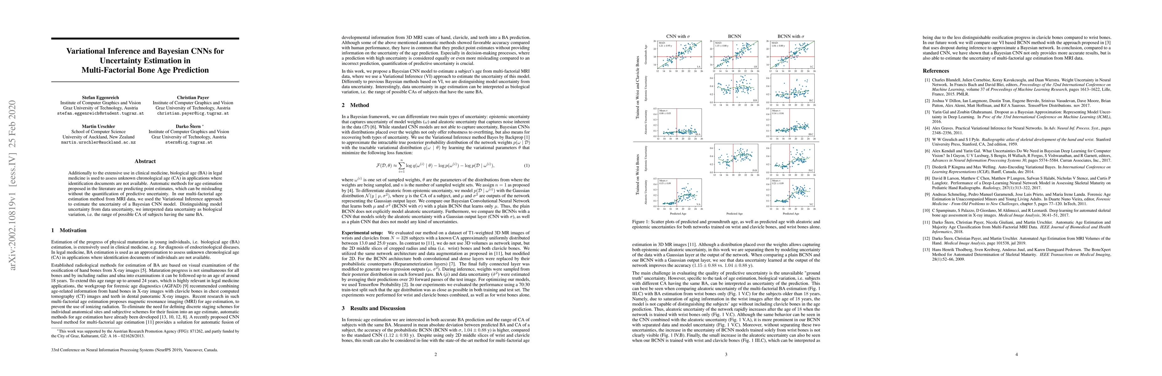 Additionally to the extensive use in clinical medicine, biological age (BA) in legal medicine is used to assess unknown chronological age (CA) in applications where identification documents are not available. Automatic methods for age estimation proposed in the literature are predicting point estimates, which can be misleading without the quantification of predictive uncertainty. In our multi-factorial age estimation method from MRI data, we used the Variational Inference approach to estimate the uncertainty of a Bayesian CNN model. Distinguishing model uncertainty from data uncertainty, we interpreted data uncertainty as biological variation, i.e. the range of possible CA of subjects having the same BA.