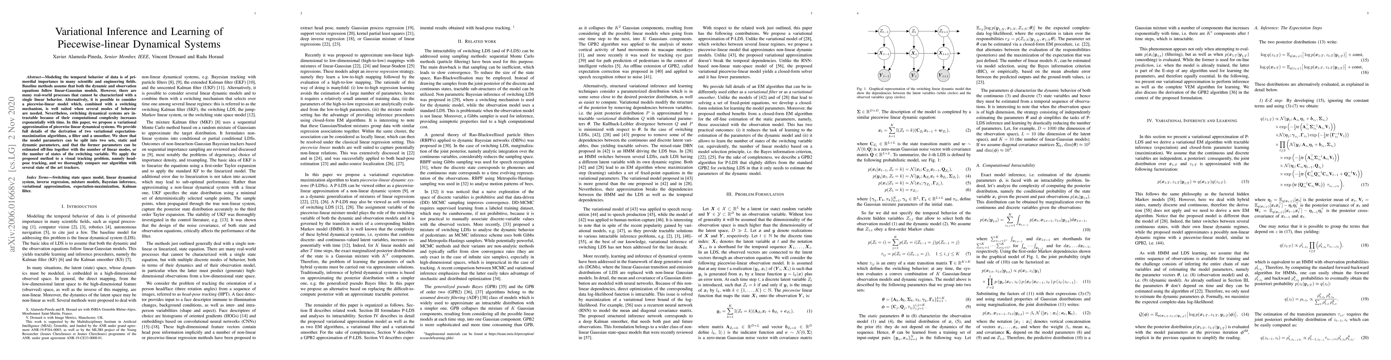 Modeling the temporal behavior of data is of primordial importance in many scientific and engineering fields. Baseline methods assume that both the dynamic and observation equations follow linear-Gaussian models. However, there are many real-world processes that cannot be characterized by a single linear behavior. Alternatively, it is possible to consider a piecewise-linear model which, combined with a switching mechanism, is well suited when several modes of behavior are needed. Nevertheless, switching dynamical systems are intractable because of their computational complexity increases exponentially with time. In this paper, we propose a variational approximation of piecewise linear dynamical systems. We provide full details of the derivation of two variational expectation-maximization algorithms, a filter and a smoother. We show that the model parameters can be split into two sets, static and dynamic parameters, and that the former parameters can be estimated off-line together with the number of linear modes, or the number of states of the switching variable. We apply the proposed method to a visual tracking problem, namely head-pose tracking, and we thoroughly compare our algorithm with several state of the art trackers.