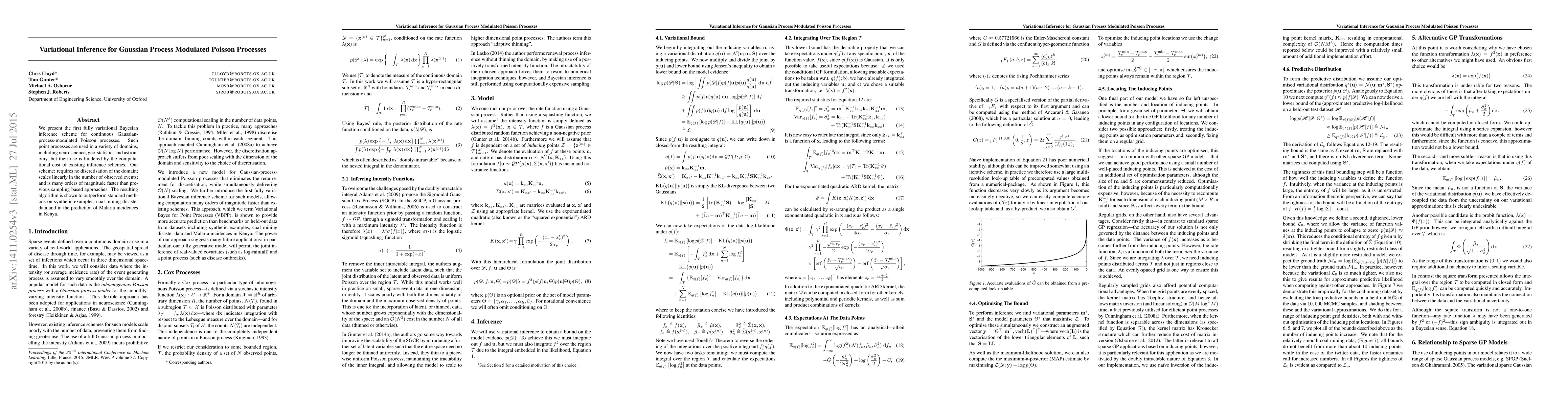 We present the first fully variational Bayesian inference scheme for continuous Gaussian-process-modulated Poisson processes. Such point processes are used in a variety of domains, including neuroscience, geo-statistics and astronomy, but their use is hindered by the computational cost of existing inference schemes. Our scheme: requires no discretisation of the domain; scales linearly in the number of observed events; and is many orders of magnitude faster than previous sampling based approaches. The resulting algorithm is shown to outperform standard methods on synthetic examples, coal mining disaster data and in the prediction of Malaria incidences in Kenya.