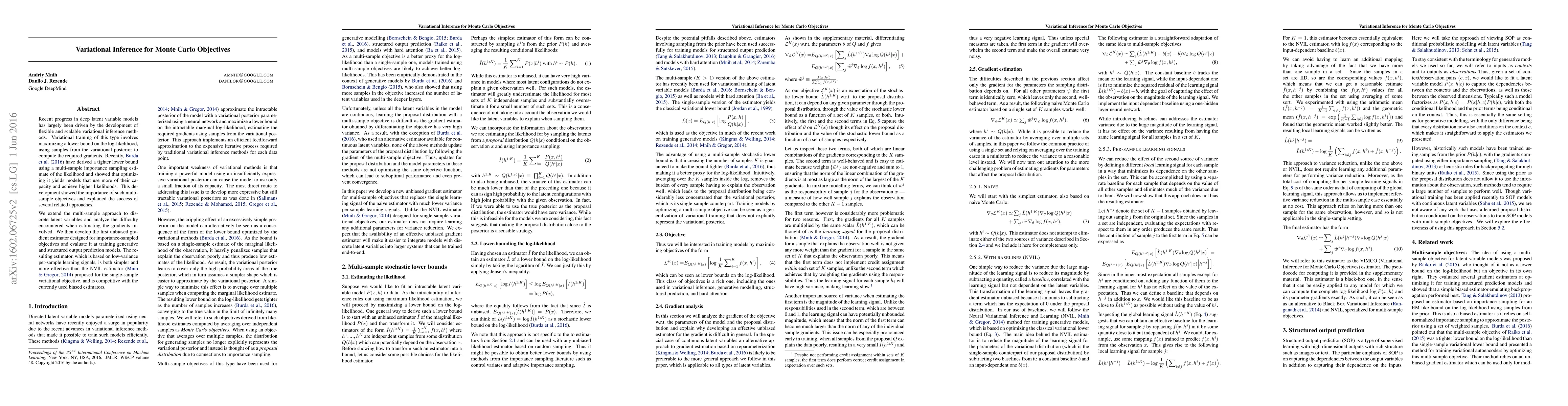 This paper extends variational inference to discrete latent variables using a multi-sample importance sampling approach, developing an unbiased gradient estimator for lower-variance learning signals. The new estimator is simpler and more effective than previous methods, achieving competitive results in training generative and structured output prediction models.