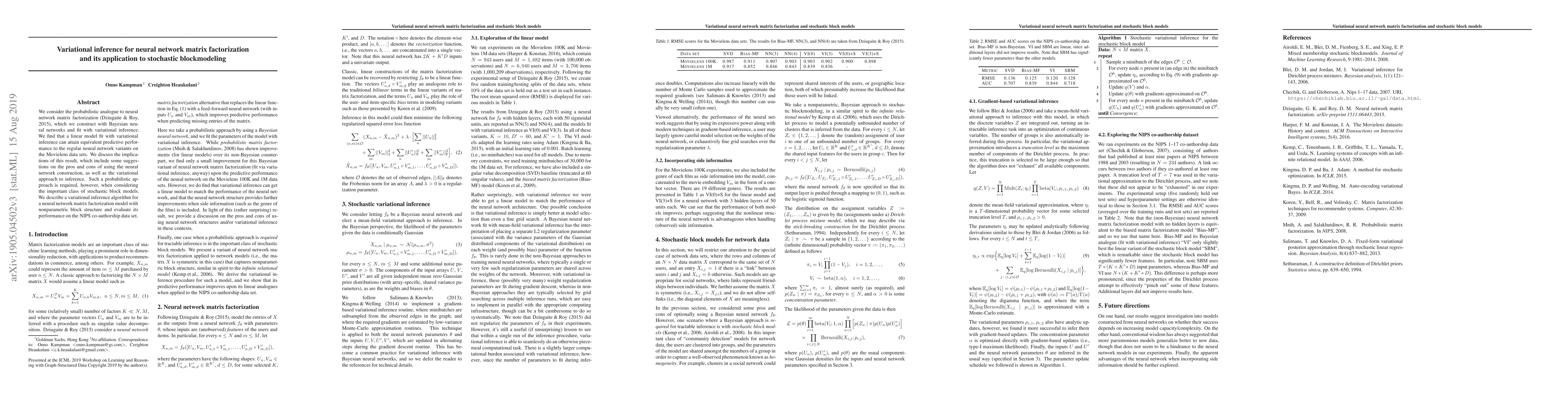 This paper develops a probabilistic neural network matrix factorization using Bayesian neural networks and variational inference, achieving comparable predictive performance to regular neural networks on Movielens data. It also introduces a variational inference algorithm for stochastic blockmodels, demonstrating its effectiveness on NIPS co-authorship data.