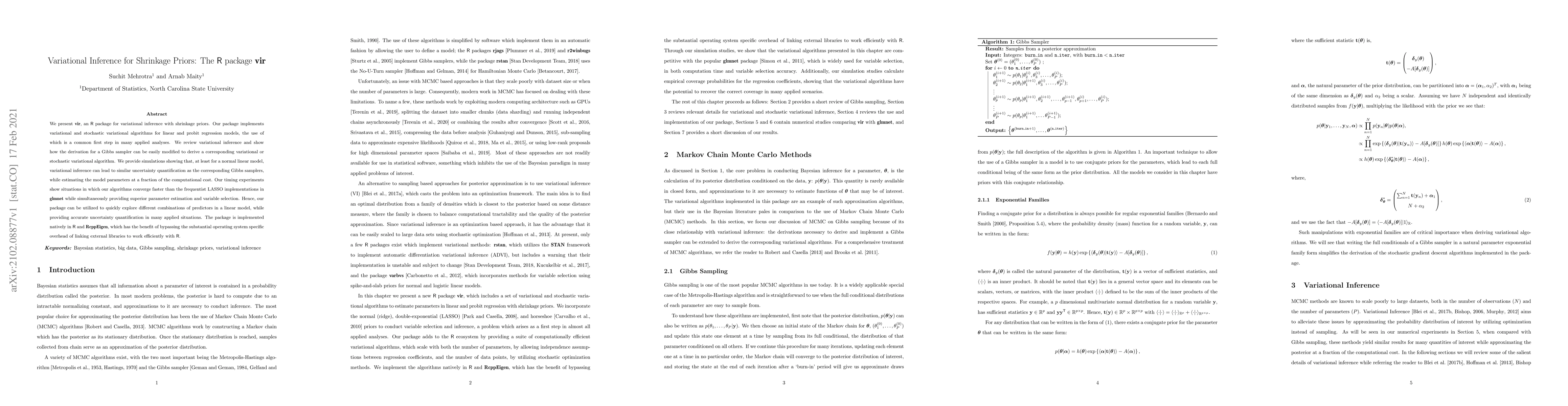 The R package vir implements variational inference for shrinkage priors in linear and probit regression models, offering faster convergence and superior parameter estimation compared to frequentist LASSO methods. It provides efficient uncertainty quantification at reduced computational costs.
