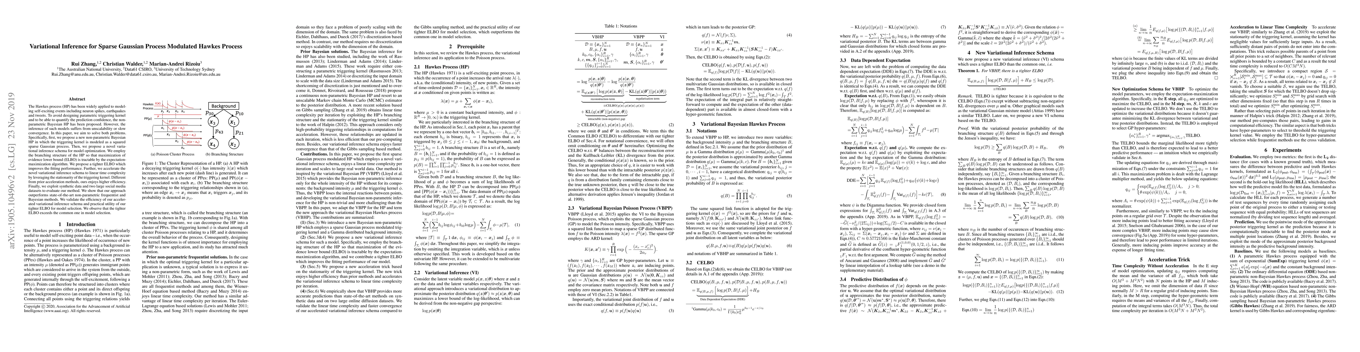 This paper proposes a non-parametric Bayesian Hawkes process with a squared sparse Gaussian process for the triggering kernel and introduces a novel variational inference method for scalable optimization. The method achieves linear time complexity and outperforms existing methods on social media datasets.