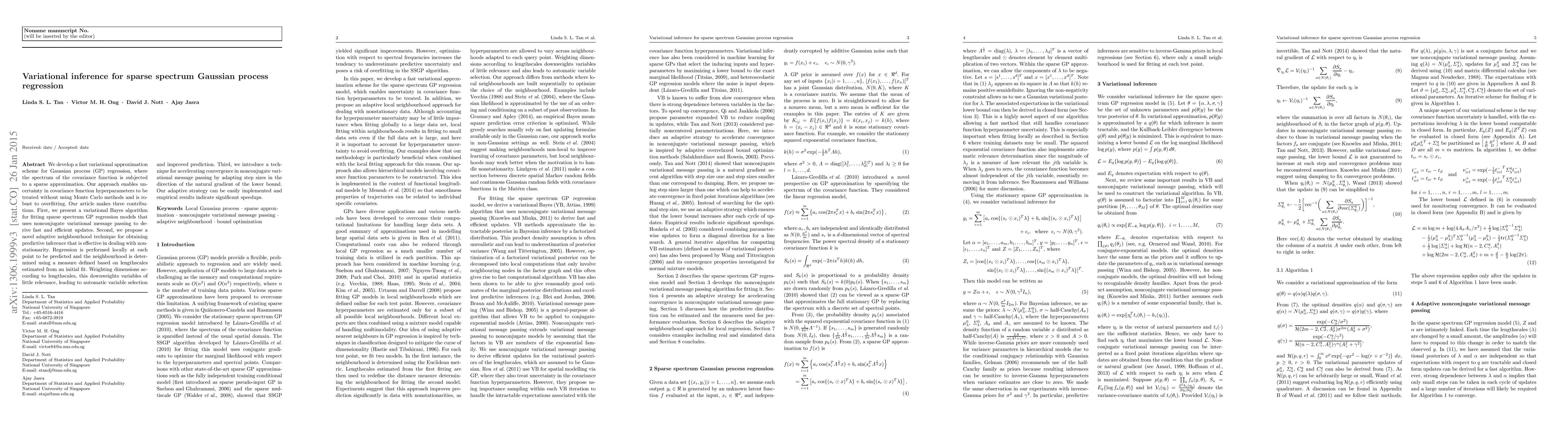 This paper introduces a fast variational inference method for sparse spectrum Gaussian process regression, enabling efficient updates without Monte Carlo methods. It also proposes an adaptive neighborhood technique for local regression and an adaptive step size method to accelerate convergence, significantly speeding up the process.