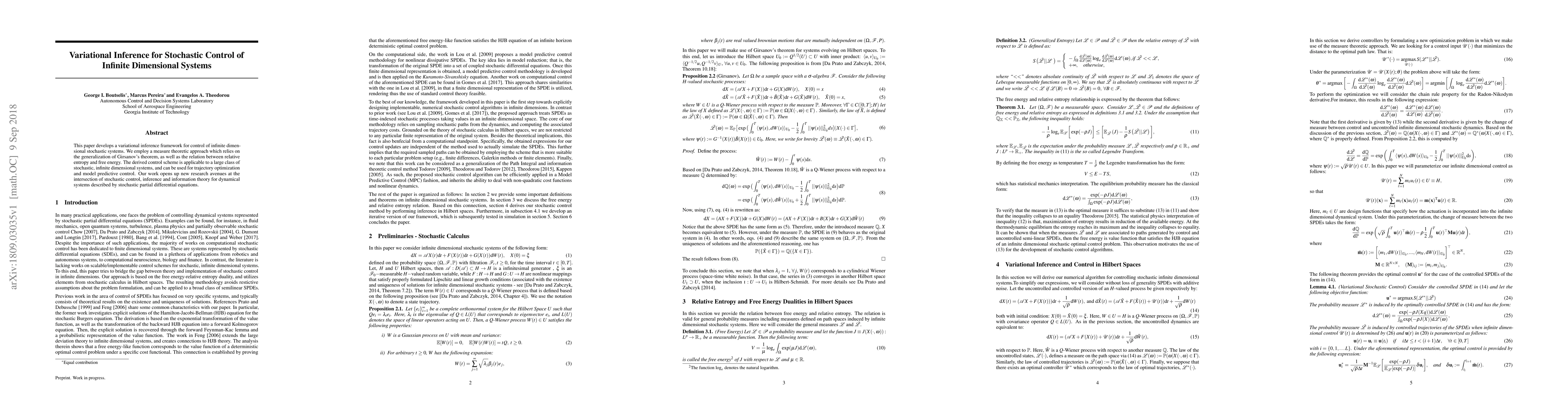 This paper introduces a variational inference framework for controlling infinite-dimensional stochastic systems, utilizing a measure-theoretic approach based on Girsanov's theorem and relative entropy. The proposed control scheme is broadly applicable for trajectory optimization and model predictive control in stochastic partial differential equations.
