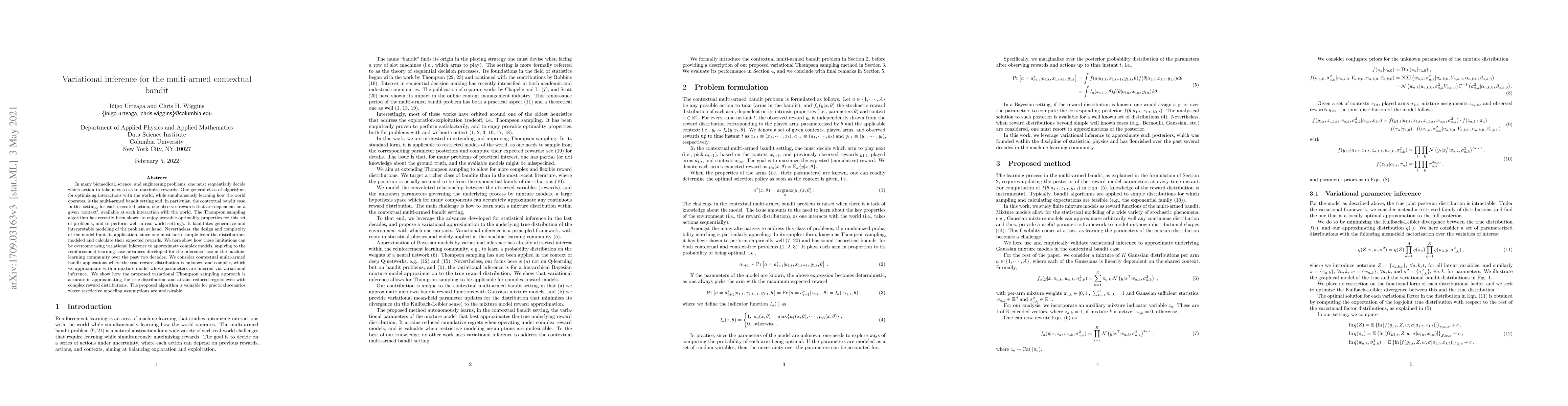In many biomedical, science, and engineering problems, one must sequentially decide which action to take next so as to maximize rewards. One general class of algorithms for optimizing interactions with the world, while simultaneously learning how the world operates, is the multi-armed bandit setting and, in particular, the contextual bandit case. In this setting, for each executed action, one observes rewards that are dependent on a given 'context', available at each interaction with the world. The Thompson sampling algorithm has recently been shown to enjoy provable optimality properties for this set of problems, and to perform well in real-world settings. It facilitates generative and interpretable modeling of the problem at hand. Nevertheless, the design and complexity of the model limit its application, since one must both sample from the distributions modeled and calculate their expected rewards. We here show how these limitations can be overcome using variational inference to approximate complex models, applying to the reinforcement learning case advances developed for the inference case in the machine learning community over the past two decades. We consider contextual multi-armed bandit applications where the true reward distribution is unknown and complex, which we approximate with a mixture model whose parameters are inferred via variational inference. We show how the proposed variational Thompson sampling approach is accurate in approximating the true distribution, and attains reduced regrets even with complex reward distributions. The proposed algorithm is valuable for practical scenarios where restrictive modeling assumptions are undesirable.