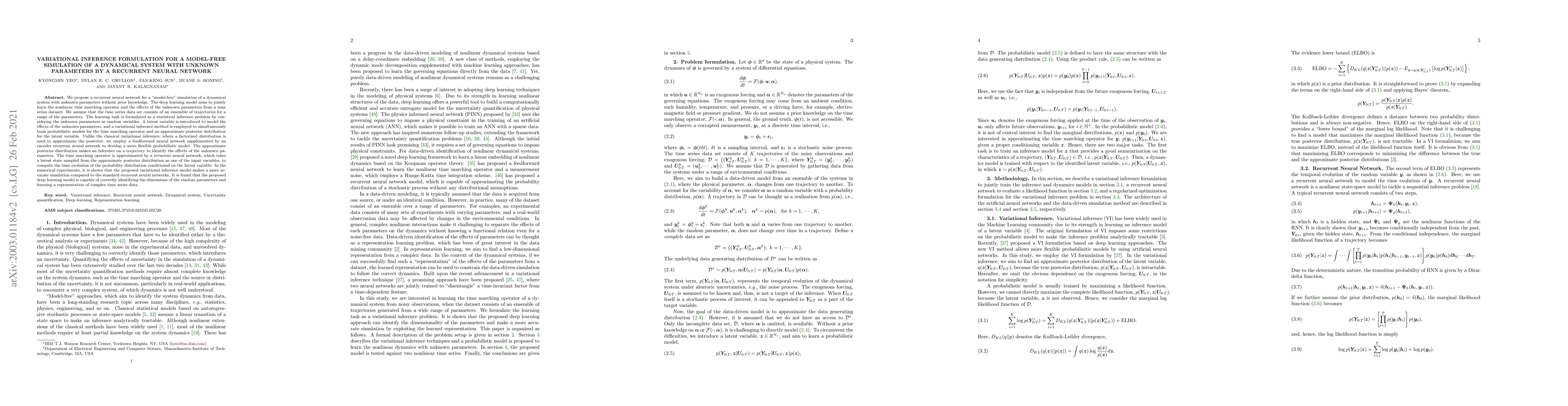This paper proposes a recurrent neural network for model-free simulation of dynamical systems with unknown parameters, employing variational inference to learn both the time marching operator and the effects of these parameters. The model uses a feedforward neural network and an encoder RNN to develop a flexible probabilistic model, achieving more accurate simulation compared to standard RNNs.