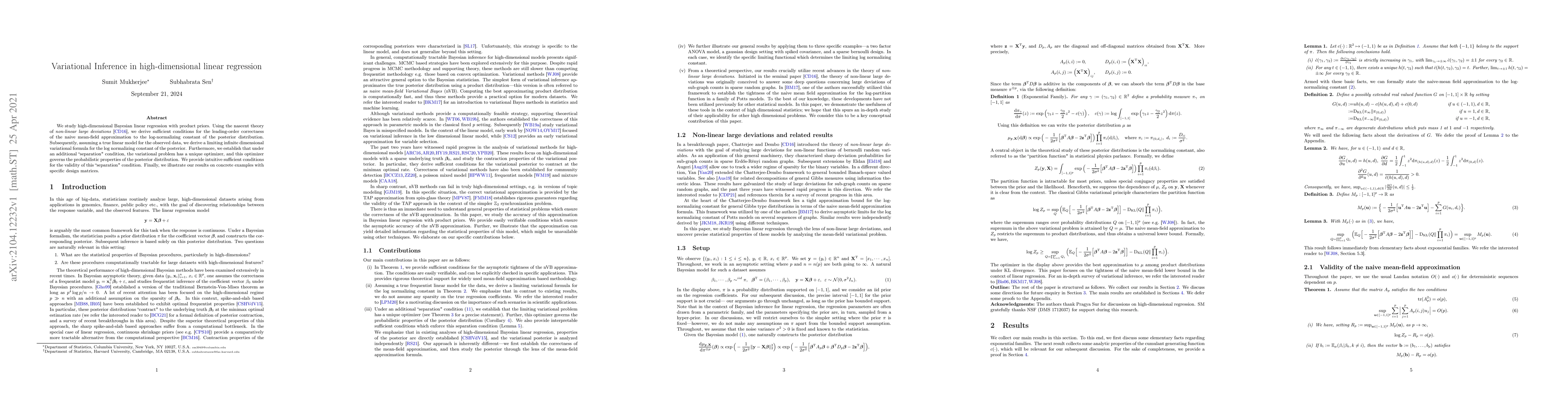 This paper studies high-dimensional Bayesian linear regression using variational inference, deriving conditions for the correctness of mean-field approximation and a limiting infinite dimensional formula, which also governs the posterior distribution under specific conditions.