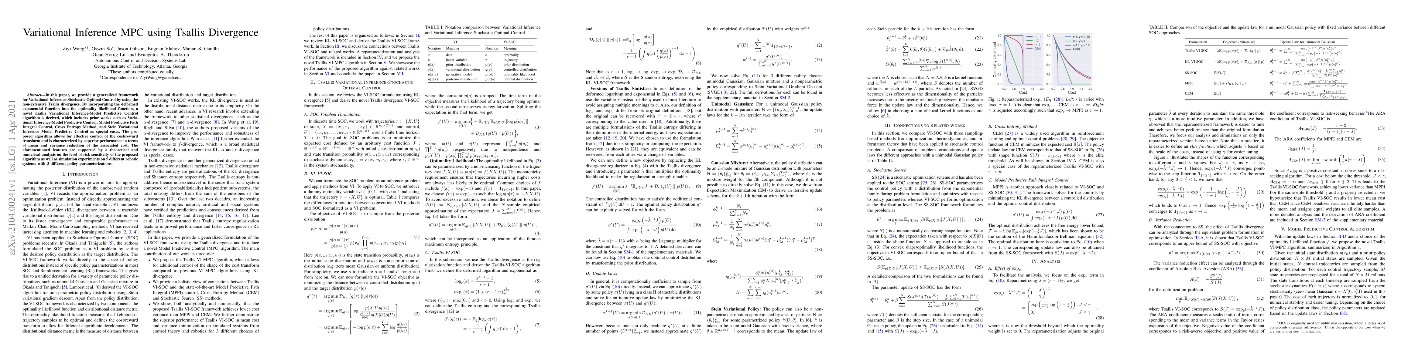 The paper proposes a Variational Inference-Model Predictive Control (VI-MPC) framework using Tsallis divergence, generalizing previous works such as VI-MPC, Model Predictive Path-Integral Control, Cross Entropy Method, and Stein Variational Inference MPC.