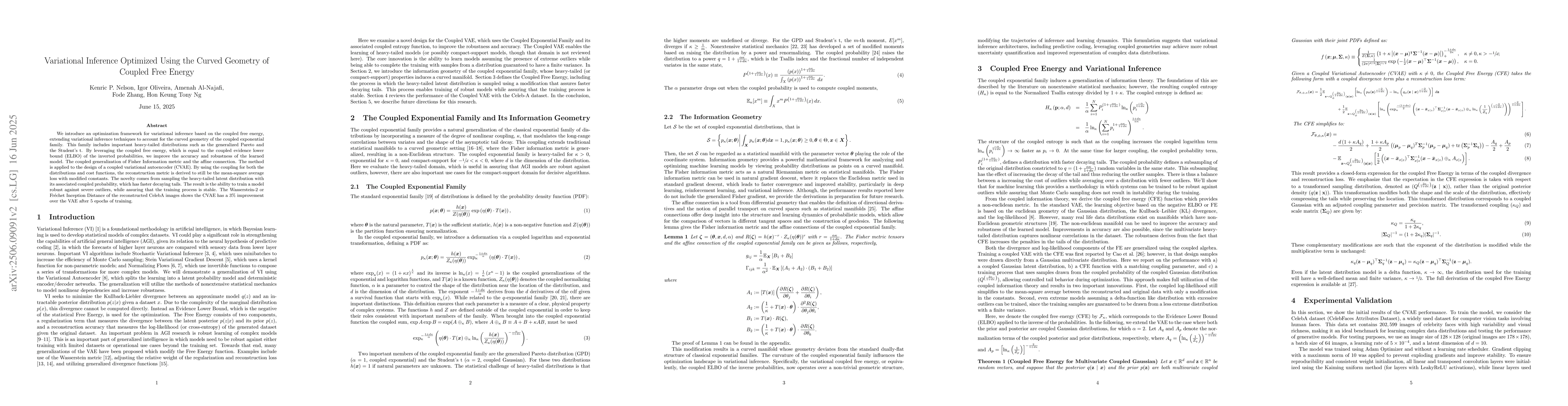 We introduce an optimization framework for variational inference based on the coupled free energy, extending variational inference techniques to account for the curved geometry of the coupled exponential family. This family includes important heavy-tailed distributions such as the generalized Pareto and the Student's t. By leveraging the coupled free energy, which is equal to the coupled evidence lower bound (ELBO) of the inverted probabilities, we improve the accuracy and robustness of the learned model. The coupled generalization of Fisher Information metric and the affine connection. The method is applied to the design of a coupled variational autoencoder (CVAE). By using the coupling for both the distributions and cost functions, the reconstruction metric is derived to still be the mean-square average loss with modified constants. The novelty comes from sampling the heavy-tailed latent distribution with its associated coupled probability, which has faster decaying tails. The result is the ability to train a model with high penalties in the tails, while assuring that the training samples have a reduced number of outliers. The Wasserstein-2 or Fr\'echet Inception Distance of the reconstructed CelebA images shows the CVAE has a 3\% improvement over the VAE after 5 epochs of training.