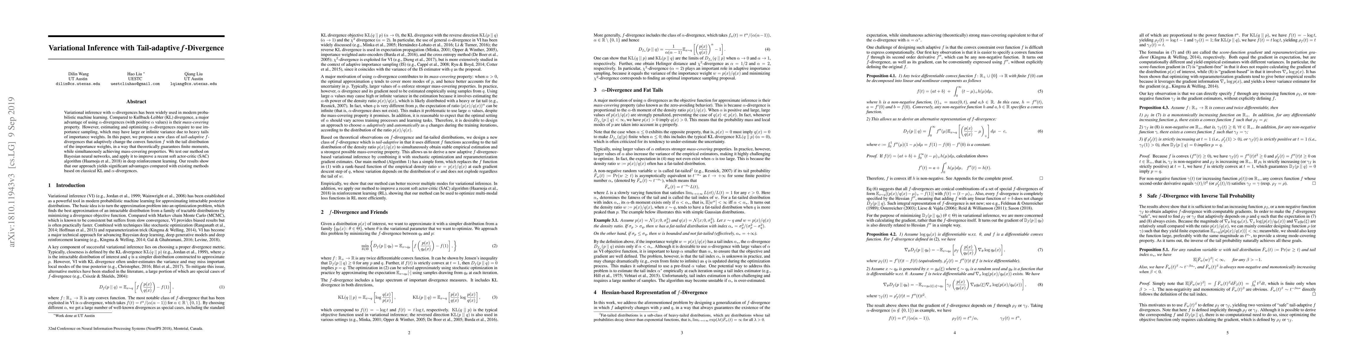 This paper introduces a new class of tail-adaptive f-divergences to improve variational inference, offering mass-covering properties while mitigating the high variance issues of importance sampling. The proposed method shows significant advantages over traditional KL and α-divergences in Bayesian neural networks and deep reinforcement learning.