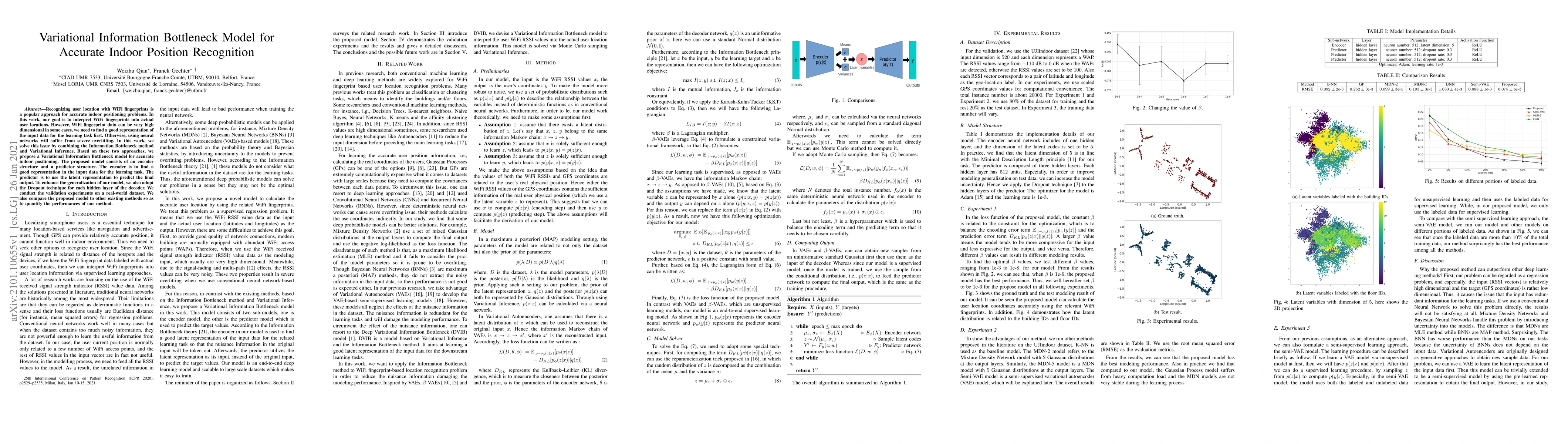 Recognizing user location with WiFi fingerprints is a popular approach for accurate indoor positioning problems. In this work, our goal is to interpret WiFi fingerprints into actual user locations. However, WiFi fingerprint data can be very high dimensional in some cases, we need to find a good representation of the input data for the learning task first. Otherwise, using neural networks will suffer from severe overfitting. In this work, we solve this issue by combining the Information Bottleneck method and Variational Inference. Based on these two approaches, we propose a Variational Information Bottleneck model for accurate indoor positioning. The proposed model consists of an encoder structure and a predictor structure. The encoder is to find a good representation in the input data for the learning task. The predictor is to use the latent representation to predict the final output. To enhance the generalization of our model, we also adopt the Dropout technique for each hidden layer of the decoder. We conduct the validation experiments on a real-world dataset. We also compare the proposed model to other existing methods so as to quantify the performances of our method.